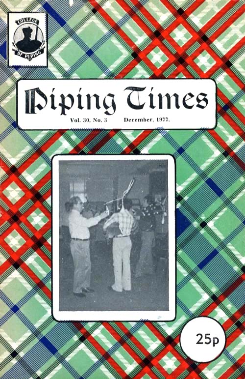 中とじ部分に、Index to Volume 29 つまり1976/10〜1977/9 一年間の総索引が綴じ込まれています。4ページ(つまり、紙は一枚)なので、ホッチキスをほぐしてこのページだけ抜き出 すために中とじ部分に入れていある ので、ページもここだけ飛ばしてあります。索引は内容別になっているのですが、特に Historical の 項が興味深いですね。 1年間に6つの記事があるようなのですが、“Eary MacCrimmon Records”(77/2)、 “The MacCrimmon and the '45”(77/3) 、“The End of the MacCrimmon College”(77/5)という具合に、その内3つのタイトルに MacCrimmon の名が出て来ています。さらに、もう一つ“MacKay of Gairloch”(77/6) という記事も有るし、やはり当時のパイピング・タイムスはピーブロック記事満載って感じですね。遡ってバックナンバーも 揃えなくてはならないか?と考えさせられます。 最後の方にちょこっと P35 Pill for Pipers?という興味深いタイトルの記事が…。