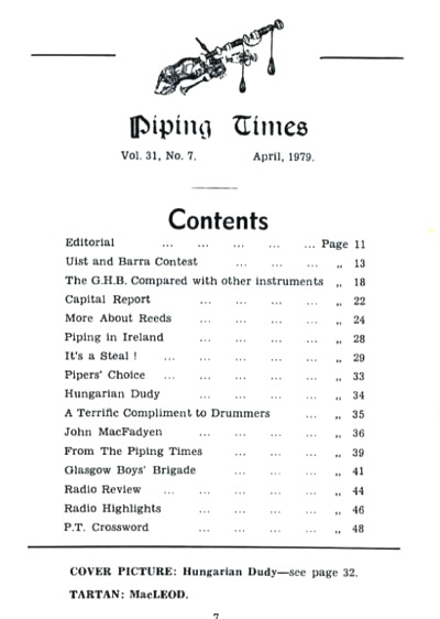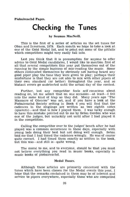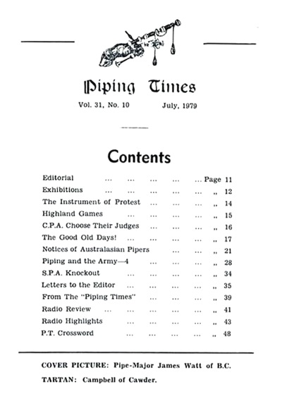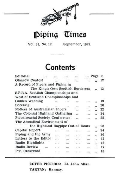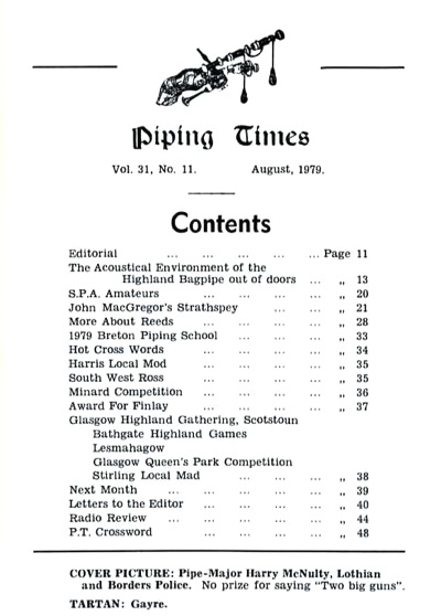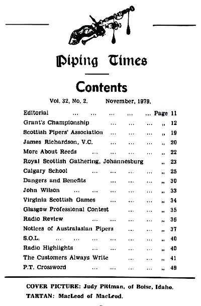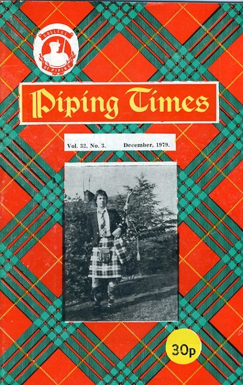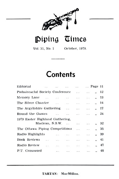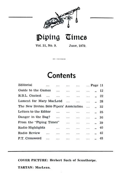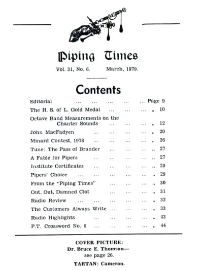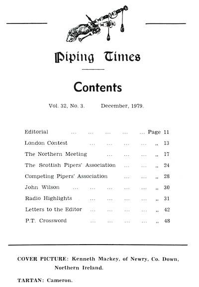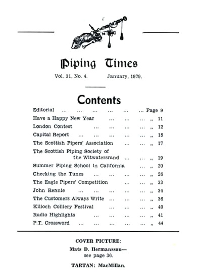 クに関する記事が始まるそうな。 続いて P12 は、1979年コンペティション・シーズンの幕開けとして1978年11月4日に開催された London Contest(正式名称は 39th annual competition of the Scottish Society of London)のリポート。 1st Murray Henderson“Lament for the Children”、Andrew Wright“Lament for the Deperture of King James”、Iain MacFadyen“Blind Piper's Obstinacy”、James MacIntosh“Old Men of the Shells”という結果だったそうです。 P20 の Checking the Tunes のコーナーは、シェーマスによるピーブロッ