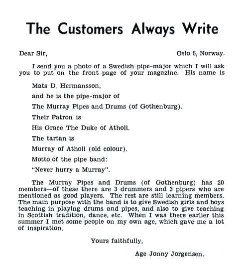 いうイギリス人らしからぬ名前がちょっと引っかかります。 投稿を読んでみて納得。この投稿はノルウェーのオスロからの投稿で、内容はスェーデンの "The Murray Pipes and Drums(of Gothenburg)"というパイプバンドの紹 介。出来たら、パイプメジャーであるこの人の写真を表紙に載せて欲しいという趣旨の手紙でした。