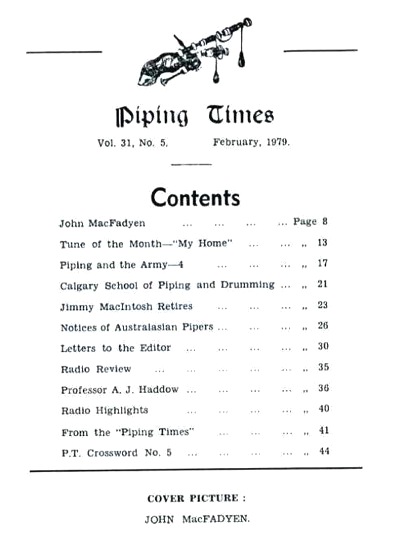 1912年生まれの A. J. Haddow は享年65歳。何故か比較的長寿な人が目立つパイピング関係者としては、John MacFadyen とともに少々早すぎる死去という印象が否めません。関係者にとってはそれだけ喪失感も大きかったことは想像して余りあります。 …とどのつまり、この号はこの当時のピーブロック関係者を襲った大津波級の喪失感を率直に表明した追悼特集号だった 訳。そして、その沈痛な気持ちの表れが空前絶後の遺影型表紙だったのですね。