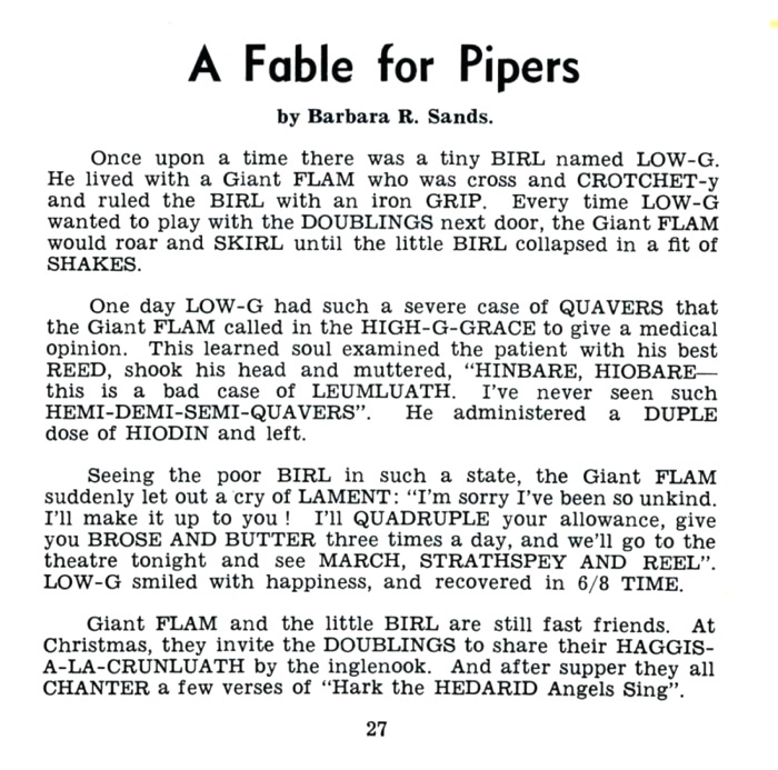 P27 Fable for Pipers(パイパーのための寓話)が面白い。 イギリス人ってのはこのような《ことば遊び》のようなことを楽しむ性癖があるようで、パイピング・タイムスにも折に ふれこのような小咄が登場します。 今回の小咄は、BIRL、LOW-G、GRIP、DOUBLING、 そして LEUMLUATH といった装飾音名から、HINBARE, HIOBARE といったカンタラックのフレーズ、はたまた、HEMI-DEMI-SEMI-QUAVERS といった音符の表記、さらには、HAGGIS-A-LA-CRUNLUATH といった装飾音名と料理との語呂合わせまで、ハイランド・パイプに関わる様々な単語が短い文章に中にちり ばめられています。