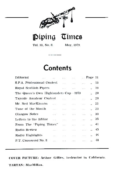 冒頭、General Frank Richardson により、このコンペティションの提唱者の一人であった(1月21日に亡くなった) John MacFadyen を偲んで、深い哀悼の言葉が述べられたということです。 参加者7人の演奏曲は次のとおり。 そして、1979年のシルバー・チャンターは、“Lament for Rory MacLeod”を演奏した Duncan MacFadyen に授与されたということで す。 シェーマスは 1978年10月号の The Argyllshire Gathering のレポートに於いて、コンペティターがやたらとチューニングに時間を掛けることによって、甚だしくマラソン化している最 近のコンペティションの在り方に強 く警鐘を鳴らしていますが、ここでもかなり辛口のコメントでレポートを締めくくっています。 曰く、「演 奏者が僅か7人だったにも関わらず、チューニングの時間は聴衆にとってあきれる程に困惑させられる最も不快な点で あった。どのパイパーもチューニングに よってパイプの調子を改善することが出来た訳ではなく、何人かはかえって悪化させていた。(チューニング時間という のは)「パイプ」を演奏できるコンディ ションにするためのものではなく、「パイパー」をそのようなコンディションにするためのものになっている。いつの日 にか、ステージに上がって1分以内に演 奏を開始するような、真のプロフェッショナルが登場する事を願うばかりである。」 引き続いて、毎年10月号定例の P17 The Argylshire Gathering の レポート。まずは、昨年からエントリーの要件が「これまでに Oban か Inverness の Gold Medal コンペティションで優勝した経験のあるパイパー」に限られるようになった The Senior Piobaireachd の結果は次のとおり。エントリーした15人の中で P/M Angus MacDonald だけが不参加だったとのこと。 1st Hugh MacCallum“The