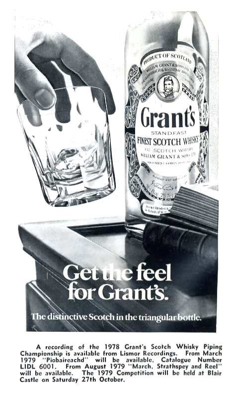 harp" とわざと?スペルミス)。 Fergus は最後に改めて聴衆に問いかけます。 "What single instrument, other than the great Highland bagpipe, can instil in men feelings of joy, peace or nostalgia, motivate them to march or dance, inspire deeds of heroism and console the bereaved ?" いや〜、日頃、周囲からの嘲笑と蔑みを一身に受けているハイランド・パイパーの積年の恨みがトコトン込められた ジョークでした。 先月号に続いて今月号でも P33 Pipers' Choice が紹介されています。今月は、The Grant's Whisky Championship(現