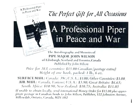 上の The Argylshire Gathering のレポートに名前が出ている John Wilson の先代の「自伝&想い出話」。30年経った現在でも未だに CoP オンラインカタログにも掲載されている息の長い本(ただ売れないだけ?)ですね。1920年代からコンペティション で活躍していたこの人、つまりは20世 紀前半の複数の重要なパイパーと同世代人だった訳で、それなりに興味深い内容のように見受けられます。シェーマスも 4ページに渡って丁寧にレビューしてい ます。ただ、文中に“〜 he is the complete egoist, 〜”なんて表現が出てくるところを読む限り、どうやらこの人かなり独善的で敵も多い人だったようです。 |