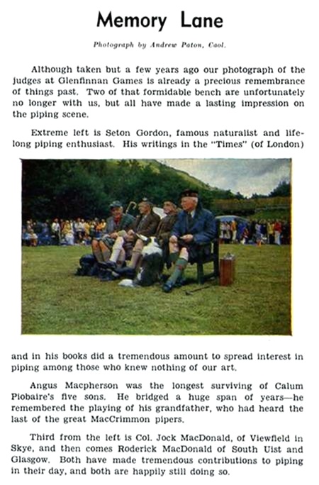 トを配置したデザインです。 通常、コンテンツ・ページのトップはエディトリアルなのですが、今回はそれすらなく、いきなり John MacFadyen の文字が目に飛び込みます。どうやら表紙のパイパーのことらしい。そして、そこから 5ページに渡ってこの人物に対するシェーマスの熱い追悼文が綴られているのです。 不肖というか、まあ、当然ながら当時の私はこの人がどんな重要なパイパーであったかは知る由もありません。しかし、この 号が発行される直前の1月21日に 亡くなったばかりのこの人を偲び取り急ぎ書かれたとしては至って中身の濃いこの追悼文を読むだけで、この人を亡くしたこ とがその当時のハイランド・パイプ の世界にとって(そして、なによりもシェーマス自身にとって)とても大きな衝撃だったことがよく伝わってきます。 シェーマスがいかにこの人物の喪失を深刻に感じていたかということは、この後自分自身が亡くなる1996年までの間 にも、幾人もの著名なパイパー(例えば、Bob Nicol や Donald MacLeod な ど)が亡くなっていますが、結局、シェーマスがこのような表紙の扱いをしたのは後にも先にもこの人だけだった、というこ とからも伺えます。多分、1917 年生まれのシェーマスよりも若干年下だったと思われる無二の僚友を思わぬ若さで(60歳前後?)亡くしてしまったその悲 しみは計りかねる程の大きさだった のでしょう。(“Piping Times”が次にこのような表紙の扱いをしたのは、シェーマス自身の死去を追悼した1996 年5月号・ Vol.48/No.8 です。) それではこの John MacFadyen とい う人がどんなパイパーだったか? ということについて、このシェーマス入魂の追悼文から読み解いてみましょう。 Mull 島と Tiree 島(Mull