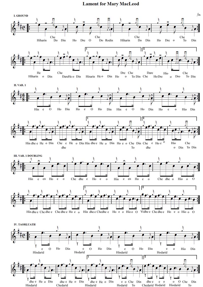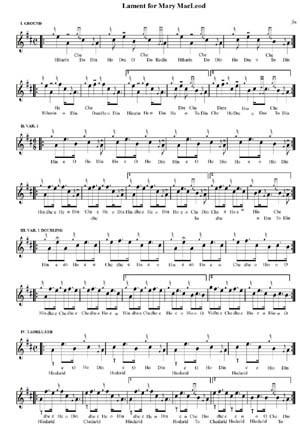 による P28 Lament for Mary MacLeod に関する解説記事です。 ところがどっこい、いや〜さすがシェーマスによるこのレポート、実に中身が濃いんですよね〜。というよりも、30年前よ りは確実に成長した自分自身のピー ブロックに関する理解力、そして、IT革命の恩恵で古い楽譜へのアクセスが可能になった最近の状況下で改めて読み返して みると、今になって初めて理解でき るようになった点が多々あるんです。 実は Canntaireachd No.9 で紹介したこの曲の主人公たる女流吟遊詩人 Mary MacLeod に関するごく簡単な紹介記事は、4ページに渡るこのレポートのほんの冒頭1ページ余りの内容でしかありません。このレ ポートの本題としてそれ以降の3ペー ジで展開されているのは、主に2種類伝承されているこの曲の表現の細かな違いなど、楽曲の構成自体についての考察なので す。 まずは、この曲に関する唯一の根拠となり得る楽譜は Angus MacKay's manuscript に掲載されているものだけ(その他の古い楽譜集には載っていない)ということで、その後は常にこの楽譜を参照しながら解説が進行します。 30 年前当時というか、実際にはそれ以降もず〜っと長い間ほんのつい一年程前までは、例えこのような記事を読み進めた際、リ アリティーを持ってその内容を理解 しようとしても、そんな思いとは裏腹に実際の読解作業はここで止まってしまっていました。何故かというと今から 200年も前の 1800年頃に書かれたそんな古文書(古楽譜)を実際に目にする事など、エジンバラのどこぞの図書館か博物館にでも出向 かなければ到底叶わなかったのです から…。 ところが、パイプのかおり第30話の中 でも紹介したとおり、近年(2008年半ば)インターネットを通じて「世界中の何処に居ても・誰でも・無料で・いとも容 易に…」それらの 200年前のマニュスクリプト類を閲覧することが可能になったのです。 そこで、今この文章をお読みになっている方はまずはピーブロック・ソサエティーの Manuscripts / Facsimiles のこのページ から Angus MacKay's manuscript の“Lament for Mary MacLeod”の 楽譜(PDFファイル)をダウンロードして開いて下さい。そして、もう一方ではごく一般的な Kilberry Book(No.96)なり Society Book(Book5/P155)、 あるいは bugpiper さんが書き起こしてくれた楽譜↓を開いて、双方を参照しながら読み進めて下さい。 さて、先にも書いた通りこの曲の唯一の根拠となっているこの Angus MacKay's MS のバージョンは、その後現在に至るまで主流として演奏され続けている Kilberry Book や PS Book のバージョンとはほんのちょっと異なる部分があります。それ は、後者では Var.1 Doubling の2列目第1&第3小節、3列目第1小節に出て来る最初の E(都 合3つの E )が、オリ ジナルたる Angus MacKay's MS では全て A であるということです。どうですか? 見比べていただけましたか? 実は、PS Book をお持ちの方はお分かりでしょうが、PS Book の楽譜と対になっている解説ページ では、こういった異なる伝承バー ジョン毎の相違点について、一つ一つの音符や装飾音毎にそれはもう正に重箱の隅を突くように事細かに説明されています。 ちなみに、ここで触れている3つの E と いうのは、PS Book で 説明されている (5) の音のことです。 オリジナルでは A の音だったこれらの3つの音を E に変えて現在の Kilberry Book や PS Bookのバージョンにした張本人は、Alexander Cameron(ツリー図参照/1848〜1923 の Junior の方)だということ。Alexander Cameron は "a great emender of tunes" と言われていて、この曲についても 彼自身の音楽的テイストに従ってこのように変えたのだと推測されています。 シェーマスは「今更、この変更が《正しい》ものなのかどうか? について論議するのは難しいことだ。なにしろ、この100年間以上に渡って非常に多くの優れたパイパーたちがこの(E の)バージョンで演奏してきているのだから…。少なくとも、このバージョンが《受け入れられる》ものであっ たことは間違いないところである。」としています。 試しに、ご自身でもこの両方のバージョンを演奏してみて下さい。確かにどちれも全く違和感なく《受け入れられる》も のであることを実感されることだと思います。そして、シェーマス自身も、「こ の曲を初めてトライする際には、両方とも試してみるべきであろう。そして、自分自身の感性に従ってより良い音楽だと 感じる方を選べば良い。」とアドバイスしています。 この他、この曲にはいくつかの装飾音についての微妙に異なったバージョンがありますが、それらは曲の表現に特別大き