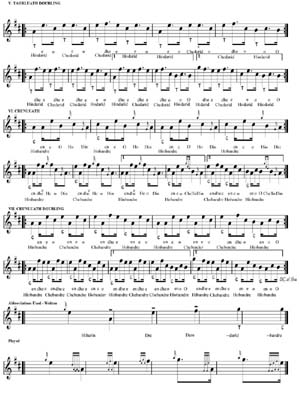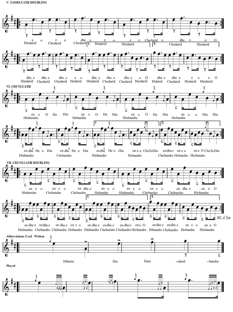 2列目最終小節の表現があります。 しかし、この点についても、シェーマスは「演奏者は前の例と同様にど ちらか好きな方をチョイスすればよい。」としています。そして、「例えソサエティーのバージョンと異なったとしても、優れたジャッジならばどちら でも良しとする見識を持ち合わせているはずである。」と断言します。 続くシェーマスの解説は Crunluath Singling について。この曲の Crunluath バリエイションは非常にユニークな構造となっているということ。具体的には「通常の Crunluath Breabach に LowA-E-B や LowA-F-E といった3連譜が挿入される形式」ということになります。そ して、シェーマスはこのユニークな装飾音について「通常5ビートとなる Crunluath Breabach のルールが適用されないことになるので、この曲に初めて取り組む者にとっては、タイミングの取り方に少々戸惑うことだろう。」と、 ここでの4ビートのタイミングの取り方について具体的にアドバイスしています。 そして、シェーマスはレポートの最後に、この曲の最も特徴的な一音について解説します。それは言うまでもなく3つの (Var.1、Taorluath、Crunluath) Doubling バリエイションの3列目第3小節最初に突然何の前触れも無く炸裂し、A のペンタトニックの構成をいとも簡単にぶち壊す、あの High G のことです。 シェーマスは、この曲の妙なるメロディーに夢見心地で聴き入っていた聴衆が、この High G の突然の一撃に椅子