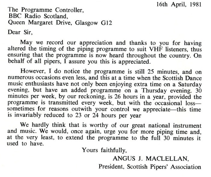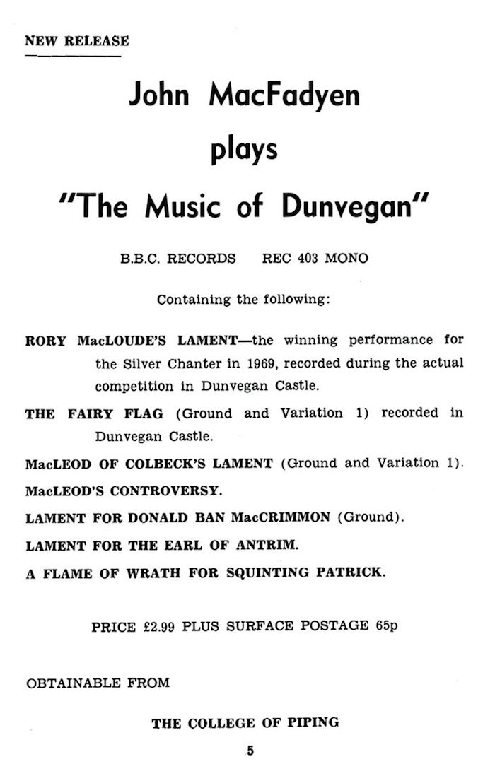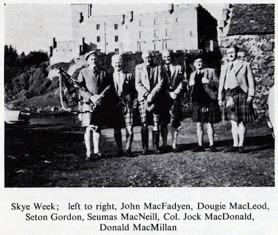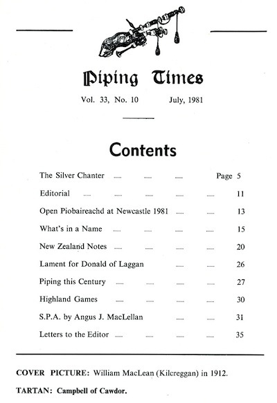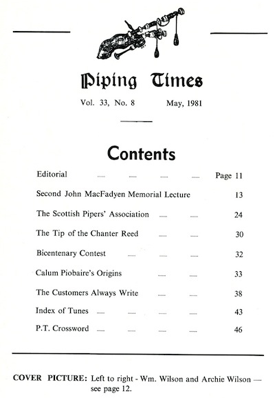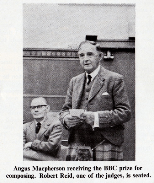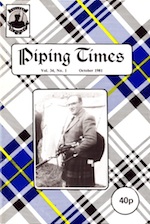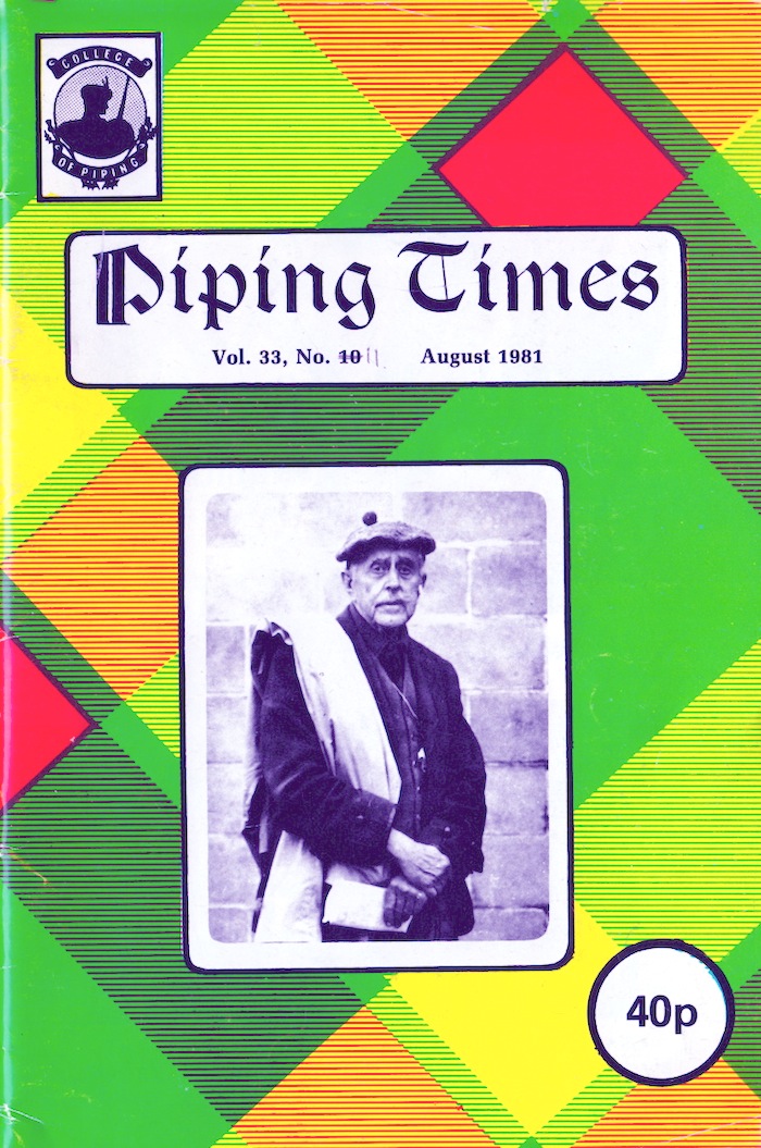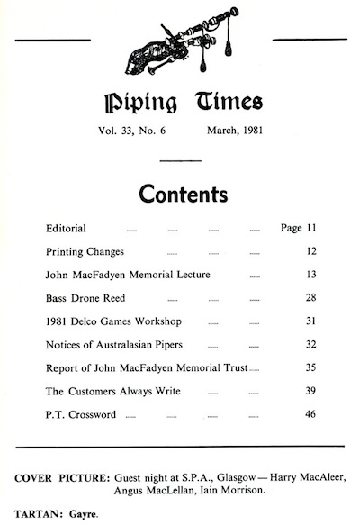 講演といっても、とりたてて堅苦しい学術的な内容という訳ではなく、至って平易な言葉で、John MacFadyen の ハイランド・パイプ界に於ける華々しい活躍ぶりと様々な尽力とその成果について語られています。それらの多くは 1979年3月号の追悼文と重複しているので、あえて紹介は避けますが、John と最も近しい間柄であったシェーマスでな らではの、生前のジョンの人柄を偲 ばせるごくごくプライベートなエピソードは大変に興味深いものです。 例えば、当時のパイパーたちに付けられたニックネームが幾つか披露されています。"Bones" はちょっと前に活躍したジャッジとして有名なあ る人物とのこと。Seumas が「この会場に来てい る」という "The Wee Man" というのは言 わずもがなの Donald MacLeod のこと でしょう。"Mac the Knife" と呼ばれる のは誰? そして、"Thin Man" はシェーマス 自身のこと。そして、John MacFadyen は シンプルに "The Big Fellow" と呼ばれていたそうな。どちらかというと肉体的なことよりも、あらゆる面で偉大だったからそう呼ばれていたのです。