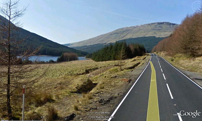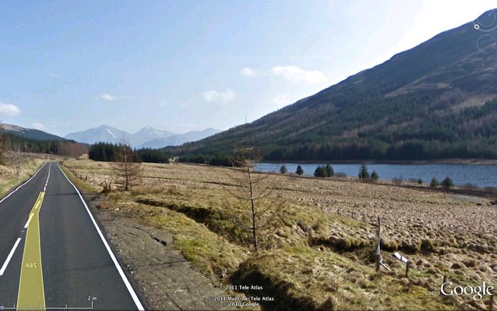 ↑ このエピソードで描かれている情報から推測して、その場所は A85号線の Tyndrum からほど近い場所にある小さな湖を眺める位置で、路肩に轍の後ある退避パースペースが確認できる正にこの辺りだと思われ ます。確かに、夏の夕日が指してい るような状況でこの場所に差し掛かったら、私も間違いなく同じことをするだろうと思います。