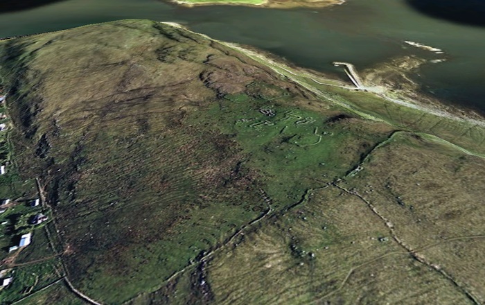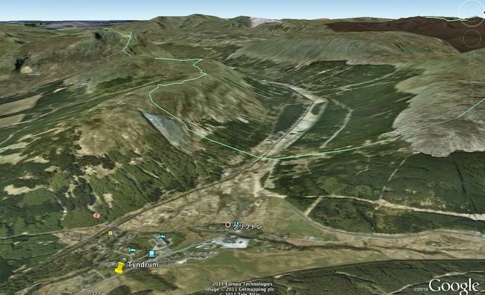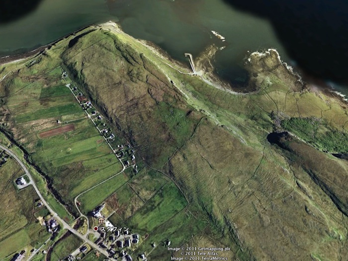 た。夕日が西から低く射す込む夕暮れのその景観は無類の美しさでした。 このエピソードを読んで、何故か私はデジャブにも似た思いを抱きました。というのも、このストーリーを読んだのがまるで つい先日の事のような気がしたので す。毎月こうして 30年前の "Piping Times" を読み返していると、どの記事についても「確かに大層昔に読んだけど殆ど忘れている」か「その当時は全く読 まなかった」というのが大方の印象 なのですが、そのような中で、このストーリーだけは読んだ時の事、そして「夕日指すハイランドの類い稀な美しい景色の中 でピーブロックを演奏するというの はさぞかし気分良いだろうな〜? 自分もそんなところに身を置いてみたいなもんだ。」と夢想に耽ったことをやけに鮮明に 覚えているのです。 さて、当時と現代とで根本的に状況が違うのは、今では単に想像するだけでなく、Googl Earth でその場を疑似体験出来るということです。例によって、この夕べに John と Seumas がパイ プを演奏した場所を推し量ってみました。