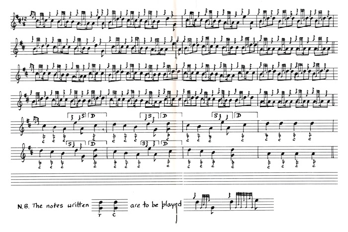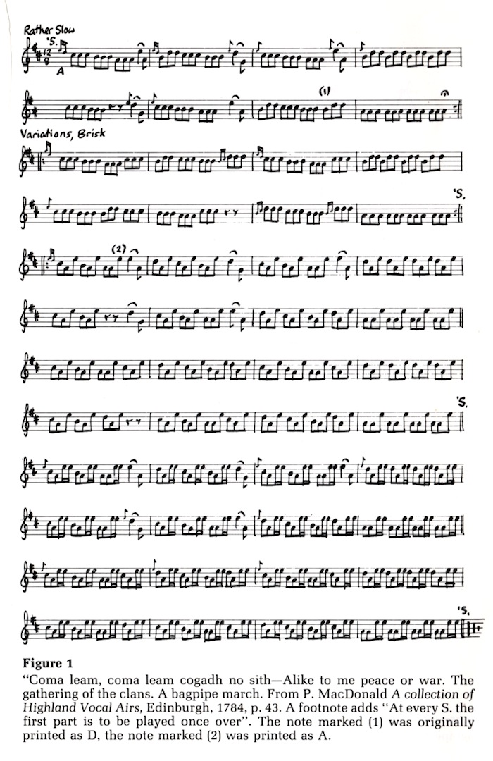 と言った、当時出版された少なくとも5つの楽譜集に収められているからである。 "War or peace, it's all the same to me. さて、キャノンは 1978年4月号 で“Cha Till Mi Tuilleh”を紹介した時と同様に Patrick MacDonald のA Collection of Highland Vocal Airs に収められている楽譜を引用して解説(解析?)します。そこでも書いたとおり、この楽譜集の編集者たる Patrick MacDonald はパイパーではなかったた め、この楽譜にも装飾音は一切記載されていませんが、至って細かいことにこだわる性格の Patrick MacDonald が書き下ろしたこの楽 譜の精度はかなり高いものである、 というのが Cannon の 見解です。