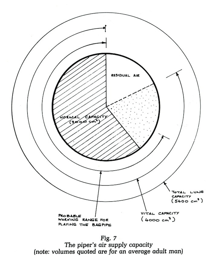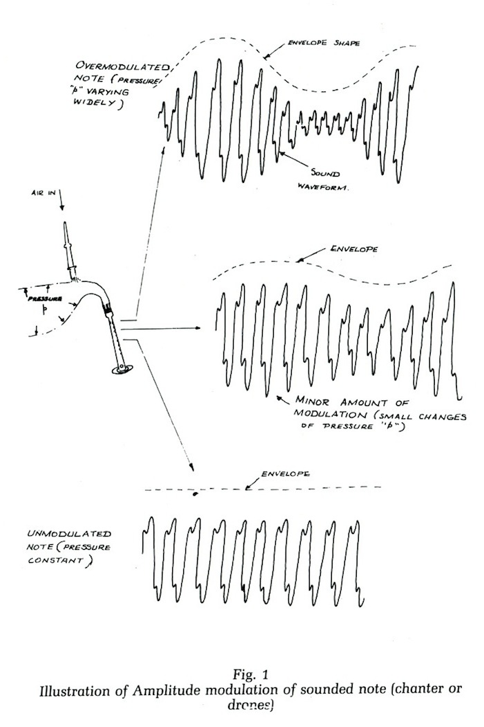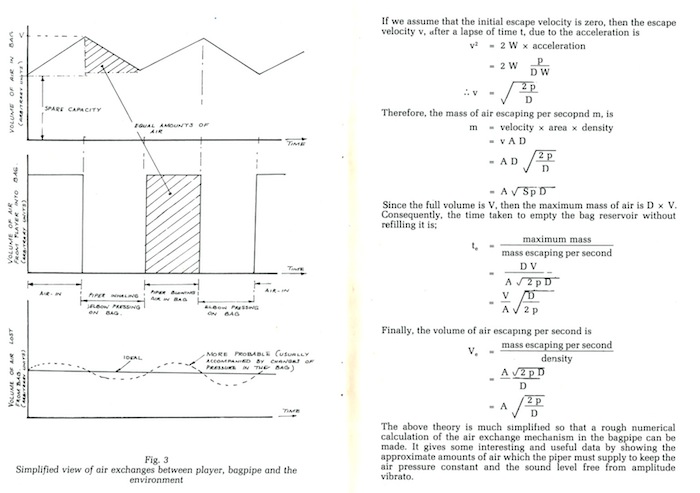 という催しがベルギーで開催されることになったというが報告されています。 P11 A Visit to Australia は、1980年4月号で紹介した記事と同じタ イトルですが、今年(1981年)は、Murray & Patricia Henderson に代わって、Jimmy McIntosh が同様の招待を受けて、のべ5週間のオーストラリア&ニュージーランドに於けるレクチャー&チュートリアル・ツアーを敢 行したというレポート。2月のうす ら寒いスコットランドを抜けだして、陽光あふれる南半球で歓待されるのは、誰にとっても歓迎すべき申し出と言えるので しょう。 P28 The Principles of Air Maintenance and Air Exchanges in the Highland Bagpipe と いう長〜いタイトルの記事は、内容も濃くてのべ 12ページに及ぶ力の入った論文です。といっても、その半分は以下のような図で、その間に理系に強くない人には到底理解 不能な数式がズラズラ並んでいると いう記事です。内容が理解できないのですから、紹介しようがありませんので、幾つかの図を転載してお茶を濁します。 では…、