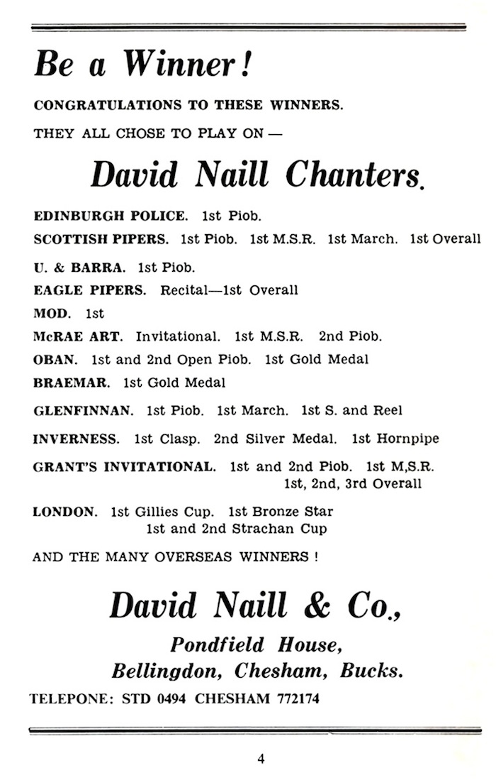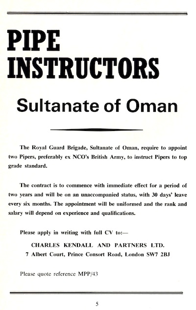 今になって振り返ってみると、注目すべきこの重要なアピール P6 THE COLLEGE OF PIPING SURVIVAL APPEAL が初めて登場したのがこの号でした。 不思議なことに、この号のページを何度見返してもどこにもこのアピールの説明が無いのですが、訴えていることは非常 にシンプルです。曰く「バグパ イプ界に於ける我々の38年間の貢献を今後も継続するためには、控えめな目標として£20,000 or $40,000 (当時の日本円にして およそ1,000万円)が必要です。」…として、寄付を募っている訳です。 この後、この募金活動の経過報告が折りに触れて出てくる様になります。 |