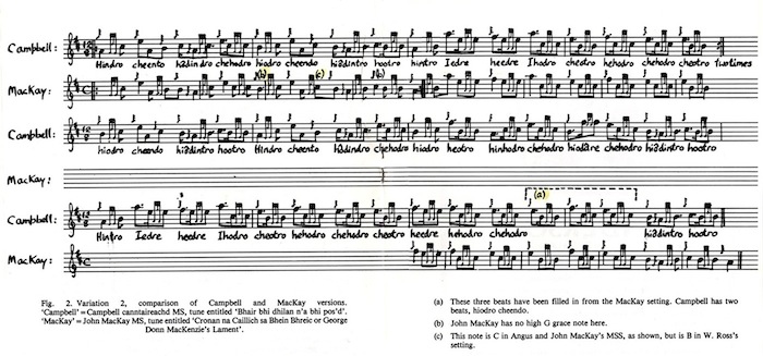 ちなみに、このようなパターンの曲としてこの他に "Lament for the Viscount of Dundee"、 "In Praise of Morag"、"Mclaine of Lochbuie's Lament"(この曲は初耳)といった曲があるそうです。 さてしかし、このように解析した場合、2nd バリエイションについてはこのパターンに当てはまらなくなります。ところが、Campbell Canntaireachd MS に於いては、バリエイション2のもっとずっと長いバージョンが収録されていて、この場合にはウルラールとより近くシンクロしているということ。Cannon はこの号のセンター見開きページの左右2ページ分を使って、次のような MacKay バージョンと Campbell バージョンを比較し た楽譜を載せています。(クリックで拡大)