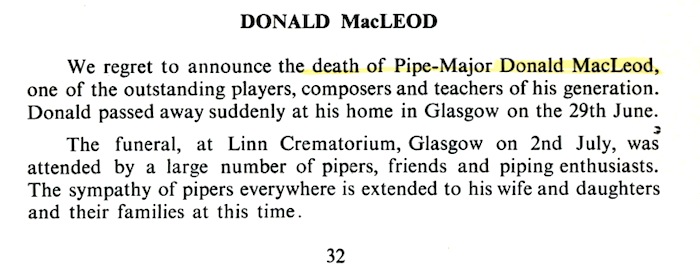 今回は、印刷にかかる様々なコストについて詳しく解説がされていて、当時の出版の様子が伺えて中々興味深いところです。 冒頭で引用されているのは、1824年に John Gow と いう人によって書かれた手紙で、70ページに 30曲のピーブロックが収められたある印刷物の場合の具体的なコスト内訳が示されています。 当時の楽譜は繰り返しも一切省略せずに全てを淡々と記するような形式が多く、例えば、Donald MacDonald's Book の場合は 117ページを費やしてたったの 23曲、Angus MacKay's Book の場合は 171ページに 61曲しか収められなかったということなどについて触れられていますが、これらも今は実際に確認出来ます。30年前にこ の記事読んでもピンと来なかったで しょうが、いい時代になったものですね。 P32 Donald MacLeod は上の Highland Society of London の記事の最終ページ・ボトムに至って素っ気無く書かれている僅か7行の記事。