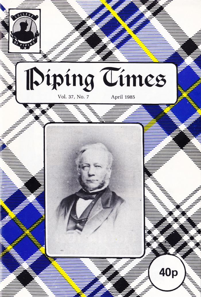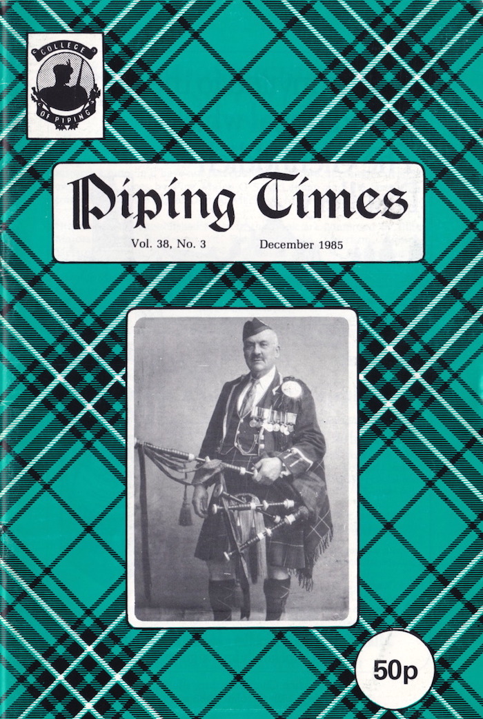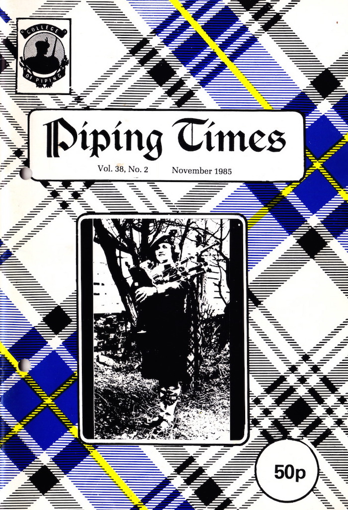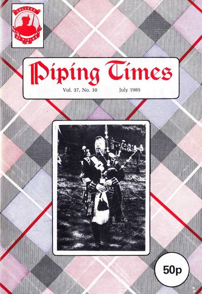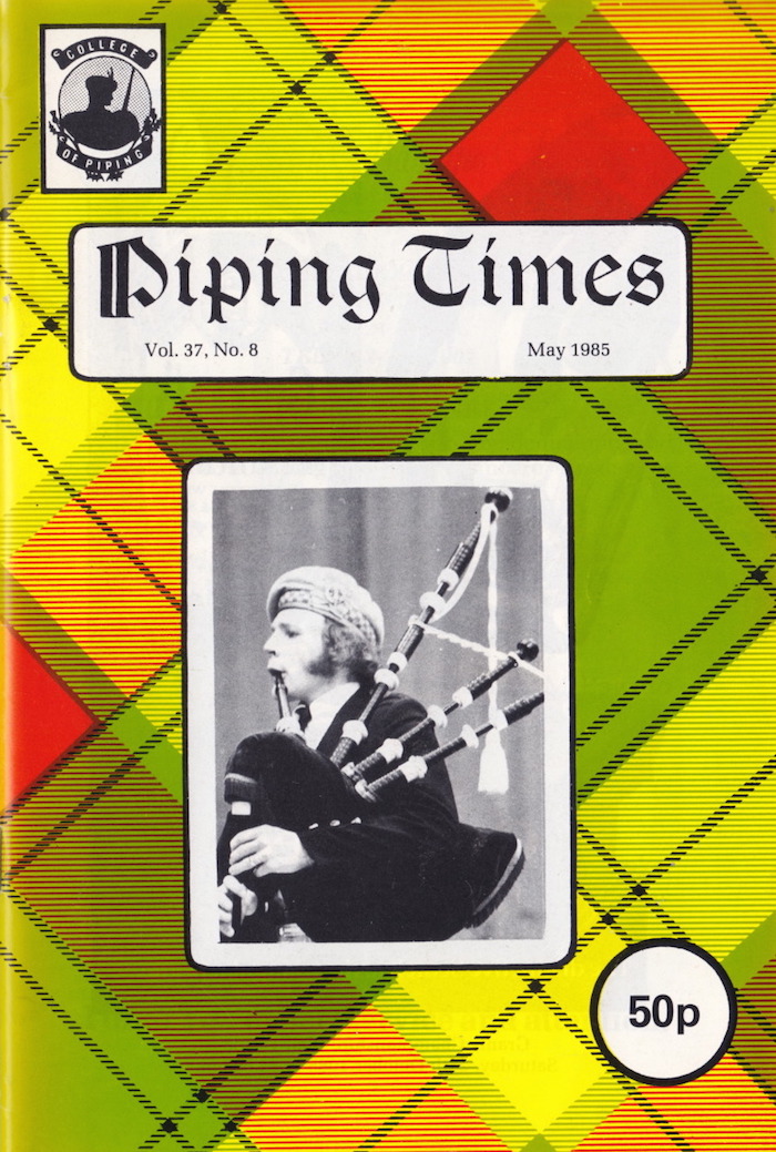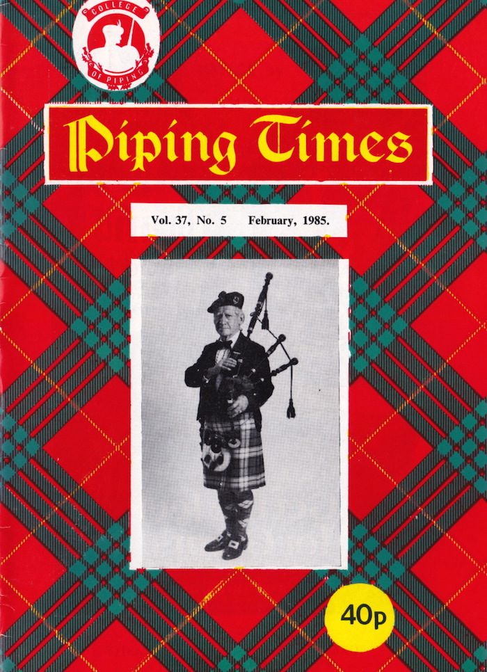 そうです、3月号の To B or not to B に対する(共感の)投稿です。 それにしても、文中で紹介されている John MacFadyen の回答は全く回答になってない何とも突き放した言い方。そして、Seumas MacNeill の編集長コメントも直接的で 刺々しいですね。この方、この様に何かにつけて自説と相反する意見を徹底してやり込めるので、生前少なからぬ人から煙た がられていた事が頷けます。 1984 年5月号でその背景を紹介しましたが、3月9日に開催されたという1985年の P17 Uist and Barra Contest のピーブロック部門では、Fred Morrison が "Beloved Scotland" の演奏で優勝しています。ちなみに競ったパイパーは20人。2位は後日のピーブロック・ソサエティー・チェアマンたる Andrew Wright の "The Earl of Seaforth's Salute" でした。 P35 From the Past は1937年に撮影されたという貴重なショット。当時の錚々たるマエスト ロ・パイパーとその関係者が勢揃いです。有名な曲のタイトルになっているご婦人も…。