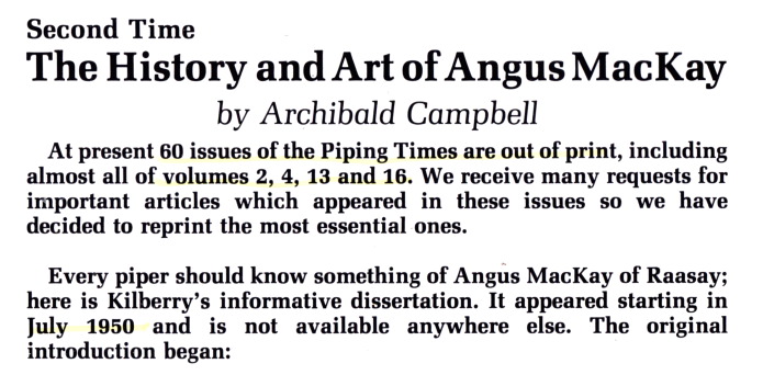 …ということで、その当時は絶版になってしまっていた “Piping Times”1950年6月号(Vol.2/No.9)〜に掲載された Archibald Campbell of Kilberry による Angus MacKay of Raasay に関する連載記 事の35年ぶりの再掲載。翌4月号と併せた2回シリーズの第1回目で、今回の7ページと次号の3ページを合わせて10 ページのボリュームです。文体から推してどこかでのレクチャーの講演録と思われます。 Angus MacKay of Raasay に 関するまとまった資料としては、1994年のピーブロック・ソサエティー・カンファレンスに於ける Seumas MacNeill によるレクチャーの講演録があります。 ピーブロックの歴史を語る上で欠かすことのできないこの重要人物については、共に非常に濃い内容のこれらの資料に基