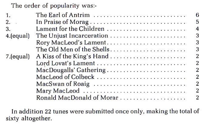 面に楽しげな旅レポートを掲載。 P24 Piper's Choice は1984年の Grant's Championship に於いて、10人のエントリー・パイパーたちが、自らのレパートリーとして選んだ6曲の人気ランキング。 ピーブロックの部門では The Earl of Antrim を選んだパイパーが6人。続いて、In Praise of Morag が5人。Lament for the Children が4人ということ。 複数のパイパーに選ばれた曲の一覧とランキングは次の通り。 |