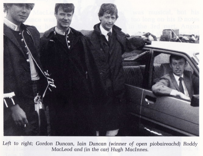 ちなみに Senior Piobaireachd の部門は、1st Donald MacPherson "Lament for Patrick Og MacCrimmon"、2nd Colin MacLellan "Glengarry's March"、3rd Hugh MacCallum "Lament for the Earl of Antrim"、4th Malcolm MacRae "Lament for Donald Duaghal MacKay" といった順位でした。 幾多の名パイパーを生み出した Uist島を舞台にした P19 South Uist Games のレポートには力が入っています。大判の写真を含めて6ページに渡ります。 ピーブロック部門には当時の若手の有望株が勢揃いといった風情。 1st Iain Duncan "Earl of Seaforth's Salute"、2nd Roddy MacLoed "Lament for Donald Duaghal MacKay"、3rd Bain MacGregor "I got a Kiss of the Kings Hand"、4th Gordon Duncan "McIntosh's Lament" という結果でした。 そして、今は亡き若き日の Gordon Duncan が 写っているこんな写真が掲載されていました。ところで、1st を獲得した Iain Duncan というのは、 Gordon のお兄さんなのでしょうか? 今や、NPCのチェ アマンたる Roddy MacLoed も若い(そ して細身)ですね。 |