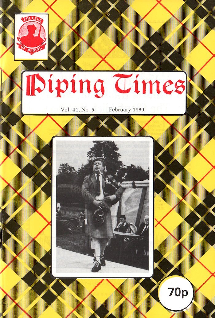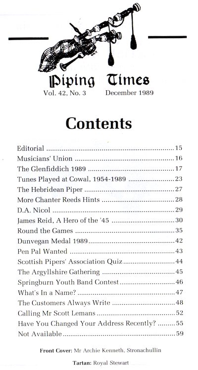 後の1冊(他の2つは1986年4月号、1987年7月号)。ざっと目を通した所では目ぼしい記事が見当 たらないので、ネタを探して細かく読み込んでいたら、興味深い事に気づきました。 上で紹介した「オリジナルの白黒コピー」である 1987年7月号で紹介した Frank J. Timoney は(その都度紹介はしていませんが)、その後、毎月と言わないまでも極めて頻繁に投書欄に投稿されていました。 この号でも、P6 Mornig Mail に「アメリカ独立戦争に於けるある軍人パイパー」に関する1ページ余りの考察を投稿。「相変わらず博識だな〜」と思っていた ら、なんとにさらにもう一通の投稿が掲載されていました。 P49 Evening Post の投稿は、6月号の S.P.A. Quiz の設問中の記述について。 その設問では、Donald Cameron の生年が1810年となっていたとの事なのですが、 Frank J. Timoney はこの人は 1811年生まれのはずだ、と指摘。参照資料を示して説明しています。 この当時の "Piping Times" はこの様な博識かつ精力的(に情報提供する)なバグパイプ愛好家(研究者?)に支えられていたのだな〜、と感心した次第。 P17 The Northern Meeting の結果は次の通り。 Gold Medal は 1st William MacCallum(Battle of Auldearn No.2)、2nd Scott MacAulay(Lament for Donald Duaghal MacKay)、3rd Wilson Brown(Hiharin dro o dro)、4th Gordon Walker(MacKay's Banner)、5th Michael Grey(MacCrimmon's Sweetheart)。 Clasp は 1st Alan MacDonald(Lament for King Geroge III)、2nd Murray Henderson (Lament for King Geroge III)、3rd Jack Lee、4th Mike Cusak P20 The Donald MacDonald Quaich Competition は第3回目。この年は6月23日に開催された由。このイベントの詳細については、1987年の第 1回と1988年第2回のレポートを参照して下さい。 この年の演奏者と演目は Robert Wallace "MacDonald's Warning"、Ronald MacShannon "The Rout of Glen Fruin"、Murray Henderson "Angus MacDonald's Assault on the MacDonalds"、Roderick MacLeod "Black Donald's March"。 ジャッジは初回から3年連続の John D. Burgess。 晴れて Donald MacDonald Quaich を授与されたのは Robert Wallace だった由。 このレポートは Malcolm McRae によるもので、量的には写真抜きの1ページ半の極めてコンパクトな内容。通常私はこの手のレポートで「各人がどの様な演奏し た…、云々かんぬん」という部 分には殆ど興味は有りません。しかし、昨今のオールドスタイルの関心の高まりから Donald MacDonald Setting に強く惹かれる様になったため、このレポートについては深い関心を持って目を通しました。そして、以下の下りなどは特に興味 深く感じた次第。(太字:引用者) Ronald MacShannon の演奏について… "Ronald chose to lengthen some of the cadence E grace notes, at the expense of the following theme notes, so that the characteristic theme of the ground of the tune was lacking." Robert Wallace の 演奏について… "It is interesting to note that he played the 'hiharin' movement with the first low A long, whereas the Donald MacDonald setting shows both first and second low A's as semi-quavers." このイベントに招待される様な凄腕パイパーたちにとっても、Donald MacDonald setting の(装飾音の)表現については、この当時は未だ不慣れで戸惑っていたのではないでしょうか。 |