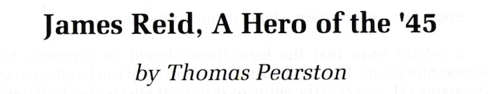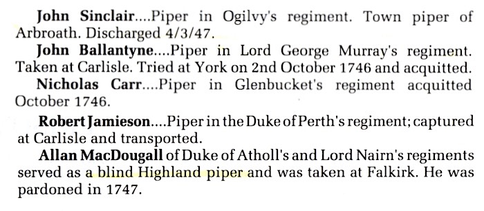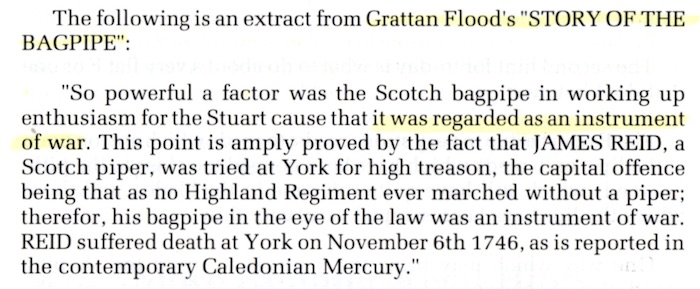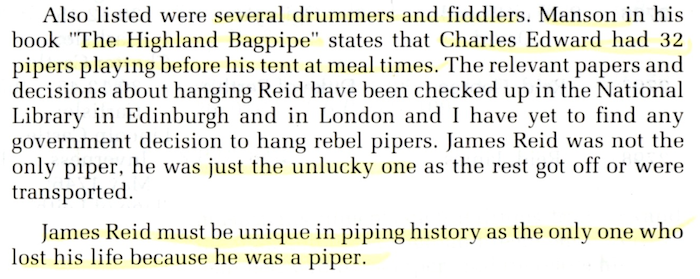 ![]() レポートの冒頭で、このイベント についてはこれまで BBC radio によって録音されるのが常でしたが、この年初めて BBC television が4台のカメラと照明器具など多くの機材を大勢のスタッフと共に持ち込んだ、との記述がありました。 その時の映像がその後いつ放映されたかは分かりませんが、その当時はそれを観ることができたのは英国内か英連邦に限られた 事でしょう。ところが、それから4半世紀後には、世界中どこでも誰でも が生中継(ライブストリーミング)を観る事も、後日編集された録画を好きな時に観る事もできる様にもなりまし た。テ クノロ ジーの進化万歳!ですね。 P27 The Hebridean Piper は9月号で紹介したビデオのレビュー。 7 月号で紹介した2本も含めたこれら3部作のビデオをプロデュースした Donnie MacKinnon という人は、それまで住んでいた米国カルフォルニアから母国スコットランドに戻って、これらのビデオを鋭意制作しているとの事。 レビューの次の様な記述が気になります。 "Apart from the piping itself the scenery is quite magnificent. For anyone who sees the spell-binding machairs and lonely exotic beaches will undoubtedly want to visit and explore these Outer Hebrides." ※ machair:in Scotland, especially the Western Isles, low-lying arable or grazing land formed near the coast by the deposition of sand and shell fragments by the wind この当時リアルタイムで購読してこの記事を読んでいたら、この3部作を迷わず購入していただろうと思うと、ちょっと心残 りです。 ![]() P30 James Reid, A Hero of the '45 の筆者はあの Thomas Pearston。途中見開き2ページ大の 参考資料が挿 入されていますが、実質的なボリュームは3ページとコンパクト。しかし、短くてもそこは相変わらずのピアストン節全開。様々な引用文が入り乱れ、直ぐに脇 道に逸れる上に、例によって文脈がメチャクチャなので読んでいる最中は主題は一体何なのか?と 惑わされます。なんとか読み解いた上で、この記事で筆者が訴えたかった事は…、 1745年の Jacobite Rising で壊滅的な敗北を喫した後、数百人のジャコバイト兵士が捕らえられ、軍事裁判にかけられた。ある者は無罪放免、ある者は有罪で流刑、そして、ある者は極刑 の死刑(縛り首)となった。捕虜の中には何名かの従軍パイパー達も居たが、縛り首になった兵士の中で、唯一のパイパーが James Reid である。 彼が有罪となった根拠は「いかなるハイランド連隊もパイパー無しには行軍は行われない。それ故、法に照らし合わせて鑑 みればバグパイプは武器(instrument of war)と見なされる。」というものである。しかし、この他の政府の決定の中でパイパーが縛り首になった判例は見当たらない。他のパイパーは無罪放免かせ いぜい流刑に処せられただけである。James Reid は単純に不運な例だったと言える。彼はハイランド・パイプの歴史の中で「パイパーである」という理由で死刑になった唯一 の存在である。 ピブロック・ソサエティー・コレクションには Nameless チューンが18曲あるが、その内の一曲のタイトルを "Salute To James Reid" としても良いのではないだろうか。少なくとも、我々は彼の命日たる 1746年11月15日を決して忘れるべきではない。 …以上、手短に纏めるとこの様な内容です。ところが、実際にはタイト ルに続けてリードも抜きで、いきなり次の様にある本の引用から文章が始まっています。 ![]() なんじゃこの Grattan