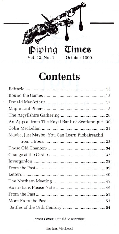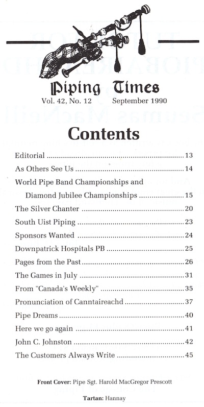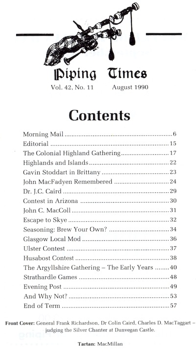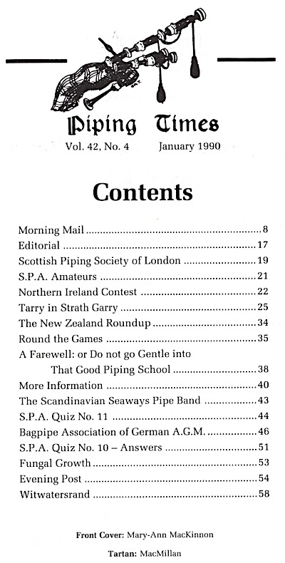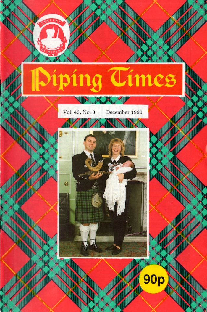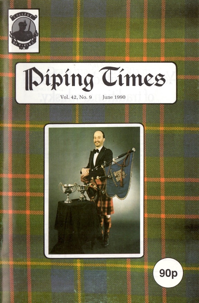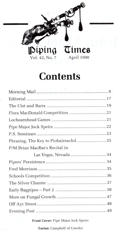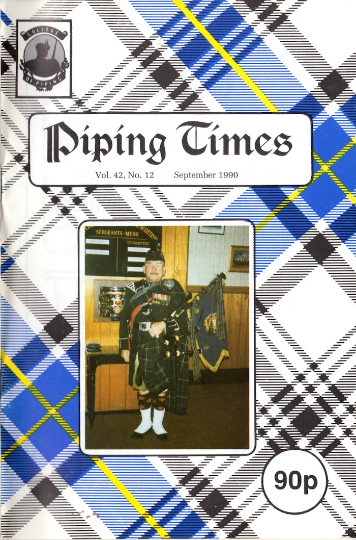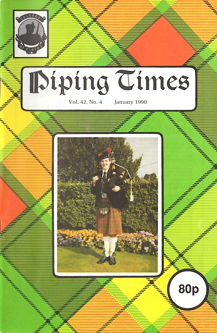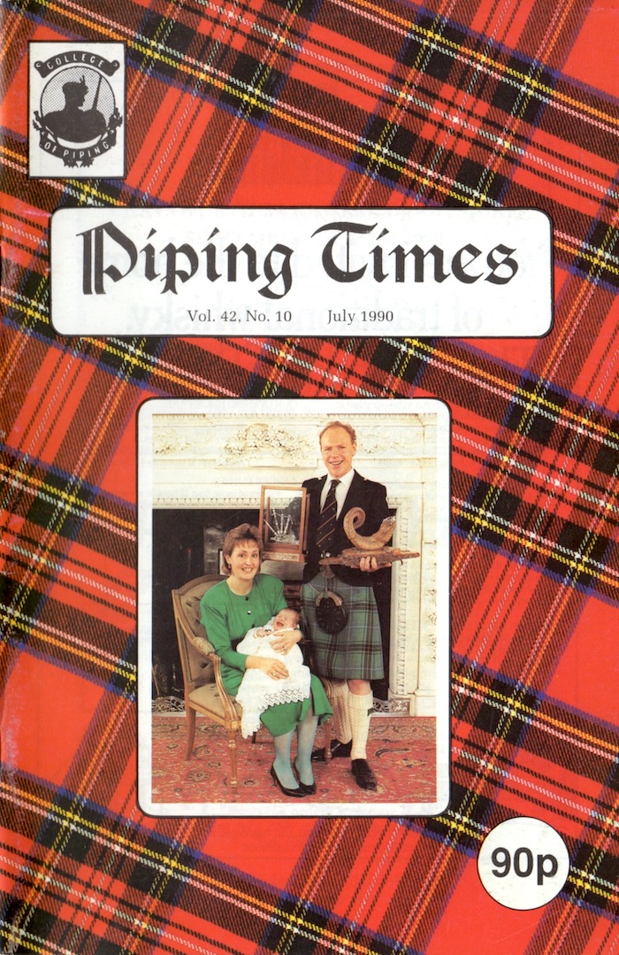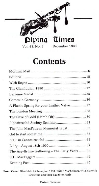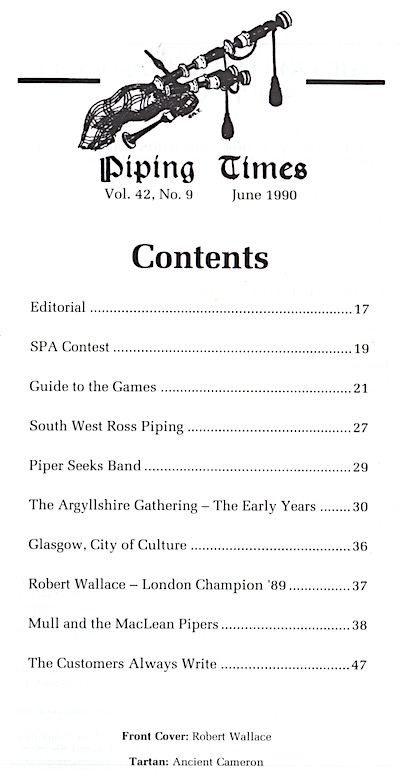 の3人が表紙写真になっていたのは記憶に新しいところ。今月号では、この年の同イベントでオーバーオール・チャンピオンになった Willie MacCallum 一家が、そっくり同じコンセプトの家族写真で登場。パイピング・ファミリー・シリーズが微笑ましいですね。 P17 The Glenfiddich 1990 はタイトル通り、17回目を迎えた今年のコンペティションのレポート。 結果は以下の通り。(冒頭の印は過去3カ年の連続出場状況/★は出場/☆は初出場/_は 参加実績無し/順位はピー ブロック部門) 1st _★★ Mike Cusack "Park Piobaireachd No.2" 2nd ★★★ Willie MacCallum "MacNeill of Barra's March" 3rd ★★★ Murray Henderson "MacDoughall's Gathering"(79、80、85、89年の覇者) 4th __★ Colin MacLellan "Lament for MacLoed of Colbeck"(87年の初出場以来3年ぶり) 5th __★ Bill Livingstone "The Battle of Pass of Crieff"(86年以来4年ぶりの登場) ![]() その他の出場者と曲名は次の通り _★★ Robert Wallace "Beloved Scotland" _★★ Alan MacDonald "Scarce of Fishing" _☆★ Gorden Walker "曲名不記載" _★_ Brian Donaldson "Lament for the Earl of Antrim" __☆ Greg Wilson(NZ) "My King has Landed in Moidart"(この年唯一の初出場) オーバーオールチャンピオンは MSRと両部門で共に 2nd