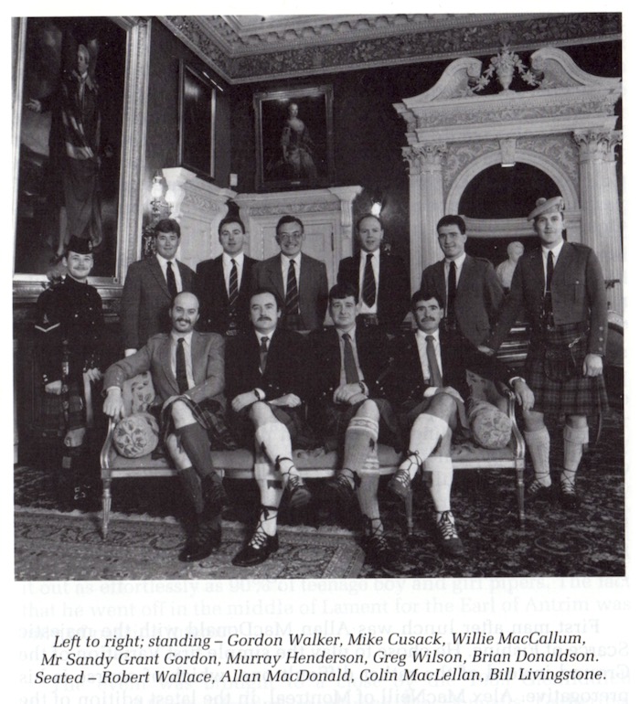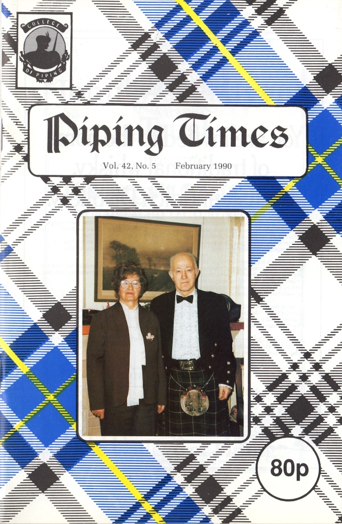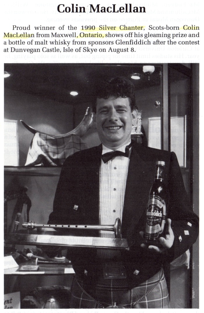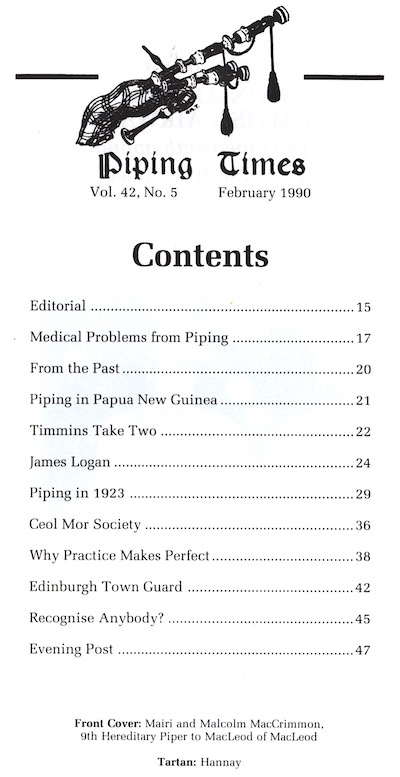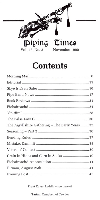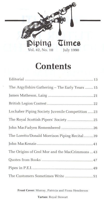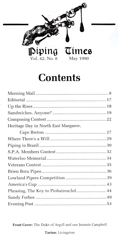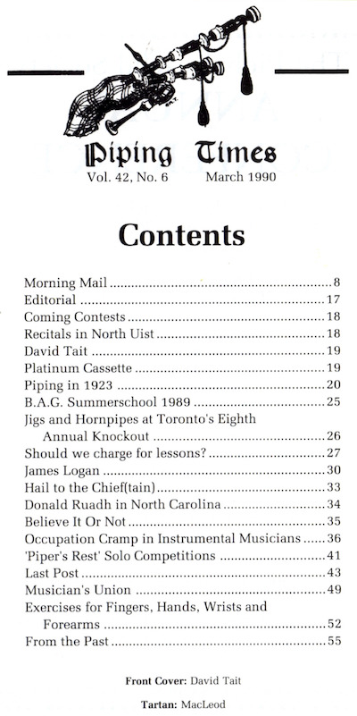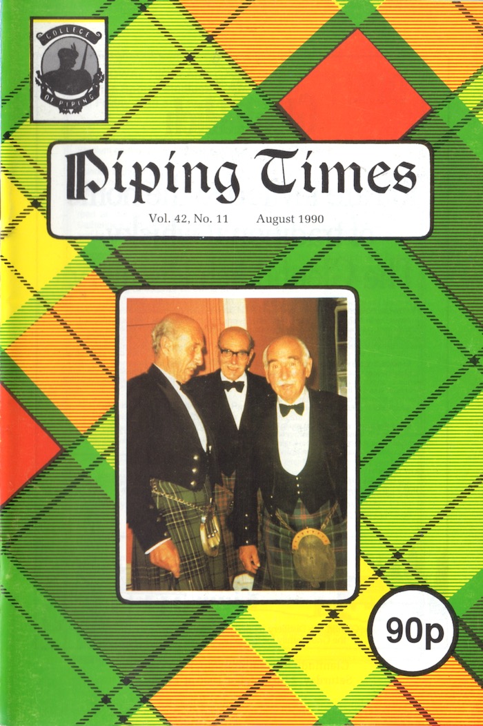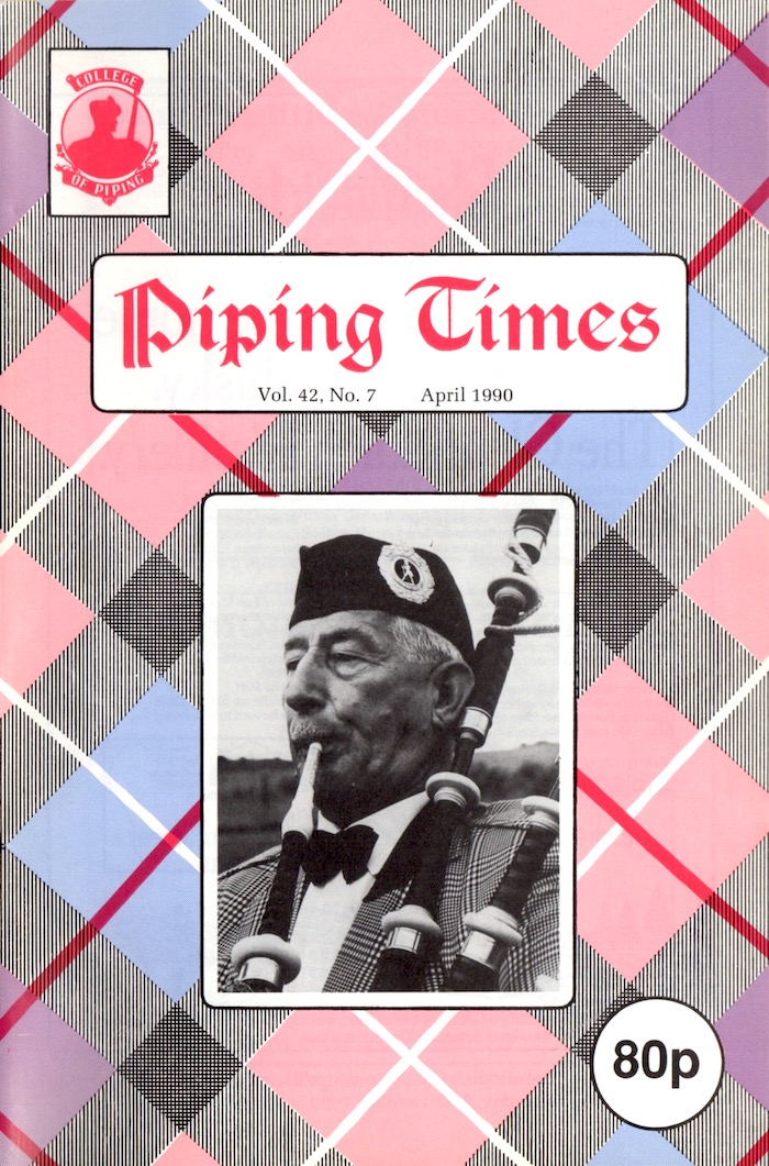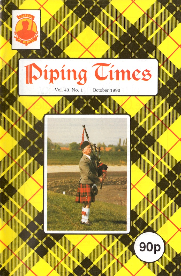 の3人が表紙写真になっていたのは記憶に新しいところ。今月号では、この年の同イベントでオーバーオール・チャンピオンになった Willie MacCallum 一家が、そっくり同じコンセプトの家族写真で登場。パイピング・ファミリー・シリーズが微笑ましいですね。 P17 The Glenfiddich 1990 はタイトル通り、17回目を迎えた今年のコンペティションのレポート。 結果は以下の通り。(冒頭の印は過去3カ年の連続出場状況/★は出場/☆は初出場/_は 参加実績無し/順位はピー ブロック部門) 1st _★★ Mike Cusack "Park Piobaireachd No.2" 2nd ★★★ Willie MacCallum "MacNeill of Barra's March" 3rd ★★★ Murray Henderson "MacDoughall's Gathering"(79、80、85、89年の覇者) 4th __★ Colin MacLellan "Lament for MacLoed of Colbeck"(87年の初出場以来3年ぶり) 5th __★ Bill Livingstone "The Battle of Pass of Crieff"(86年以来4年ぶりの登場) ![]() その他の出場者と曲名は次の通り _★★ Robert Wallace "Beloved Scotland" _★★ Alan MacDonald "Scarce of Fishing" _☆★ Gorden Walker "曲名不記載" _★_ Brian Donaldson "Lament for the Earl of Antrim" __☆ Greg Wilson(NZ) "My King has Landed in Moidart"(この年唯一の初出場) オーバーオールチャンピオンは MSRと両部門で共に 2nd