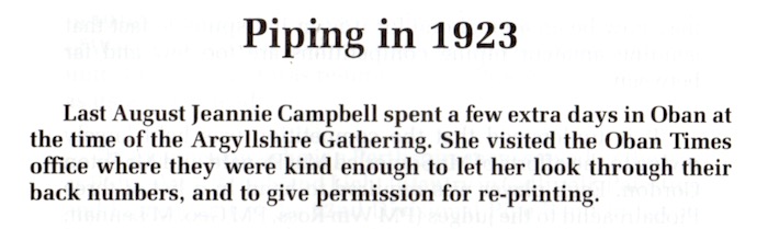 5ページ強。7月の紙面には、Charles Bannatyne が6月の The Cowal Gathering で催された juvenile competition に関して投稿しています。曰く、 "No boy can make a good job of a piobaireachd until he is nearly 20 years old. As an artist he can make no show till 30 or over." とご意見。 翌週には 'A Lover of the Old Music' という投稿名の人物が "There is far more to piobaireachd than just manipulating the fingers and playing the note correctly." と同意しつつ、実に的を得た見識を書いています。 一方でその翌週には、ある人物から "G. S. MacLennan could play at 20 so why shouldn't anyone of 20 play as well as at 40" と、若干の反論が…。 8月の紙面には更に両サイドの意見が続きます。 "Boys can play, there are plenty of good boys in Glasgow and plenty of good teachers." "Good pipers were still good when they were young. Sandy Cameron got first at the Northern Meeting when aged 17." "Piobaireachd needs years of study. G.S. is a better player now than he was 20 years ago." "Good pipers were not as good when 18 or 20 as they are now." "John MacDougall Gillies missed from the list of Glasgow teachers." そして、この論争は次の投稿でトドメが刺されたとの事。 "Some boys of 18 play better than some men who have grown old in the attempt" 確かにおっしゃる通りです。 The Cowal Gathering での juvienile competition に 関する投稿としてもう一つ興味深い記述が目に着きました。 それは、2人のコンペティターが crunluath バリエイションの前にもう一度ウルラールを演奏しようとしてジャッジから止められた事に対する疑義。原文は次の通り。 "Two competitors in the juvenile event were stopped by the judges for repeating the ground before the crunluath although it is distinctly marked in the books to do so." それぞれの曲は Angus MacKay's Book の "Glengarry's Lament" と、D. Glen Collection の "Little Spree" です。確認してもらえば分かる通り、どちらの楽譜にも確かにその様な指示が書かれています。そして、文章は "Were the judges right and should't a standard be fixed ? " とかなりの怒りを込めて締め括られています。 George Moss に よるとこの当時は、ピーブロック・ソサエティーによる《標準化》が急激に進められた頃。しかし、これを読む限りでは、それらに対する異議の表明もまだまだ 盛んだった様です。 9月の紙面にはまず、今と変わらず The Argyllshire Gathering のフルリポートが掲載。Gold Medal 部門には知らない名前が並んでいましたが、過去の Gold Medalist たちで競われる Open Piobaireachd 部門の順位は Robert Reid、G. S. MacLennan、William Ross の順でした。ジャッジとしては Archibald Campbell of Kilberry 以 下、錚々たる貴族のお歴々が名を連ねます。 9月下旬の紙面を飾るのは The Northern Meeting のフルリポート。 Gold Medal 部門では Angus MacPherson が初優勝。そして17才の息子 Malcolm Ross MacPherson が 初出場で4位入賞したのはこの年です。(彼は翌1924年も再び4位、1925年に3位、 そして、1927年には弱冠20才にして優 勝。詳しくはパイプのかおり第34話を参照。) そして、過去の Gold Medalist たちで競われる Clasp 部門の内容が極めて興味深いもの。Jeannie Campbell が前編の冒頭で示唆していた理由 が 良く分かりました。 資格のある6人の名手たちで争われたこの部門では、当初 William Ross と Robert Reid が タイで1位になりました。賞金については1位と2位の賞金を合わせて半分づつに分け合ったのですが、優勝盾を受け取る決着を 付けるために、2人がそれぞれ "The Unjust Incarceration" を演奏して優劣を競ったのです。その結果、Ross の方が より完璧な演奏をしたと判定。優勝盾は Ross が受 け取る事になったのでした。 10月の紙面では、この年のパイピングイヤーに於ける Ross と Reid のハイレベルな闘いについて振り返っている次の様な投稿がありました。 "At Oban Reid carried off the first prize, and at Inverness he and Pipe Major W. Ross tied. For a tune they were both asked by the judges to play "Cille Chriosd (Glengarry's March)" in the afternoon, and on the playing off of the tie they both played "The Unjust Incarceration". Ross played the tune through without mistake. Reid made a couple of slips in the first variation which allowed Ross to win the clasp to the gold medal. But apart from the mistake, and perhaps a slightly hesitating start, Reid's playing was very fine indeed, his Crunluadh-Amach(原文通り)being brilliantly executed." この時の2人は本割りでも優勝決定戦でも同じ曲で競った訳です。当時の相当にハイレベルなパイピングシーンを彷彿とさせま すね。 ![]() P30 James Logan も先月号から続く2回連載の後編。通算では Part IV です。 先月号の Part IIIで は主に James Logan の情けない人物 像にスポットを当てていましたが、今回は本題。つまり「大英博物館に収蔵されている Angus MacKay's Book のオリジナルの一冊の "Historical Notes" の表題の下に "by James Logan" と書かれている事の真偽」について。…ですが、実はこの点については、Frank J. Timoney による Part2で 散々振り回されたので、正直な所もうどっちでもいいや、という感じがしています。 "MacKay's Piobaireachd" とサブタイトルされた本題は、今回の3ページ半の記事の内ほぼ半分が費やされていますが、結論から言えば筆者は James Logan が Historical Notes を執筆した