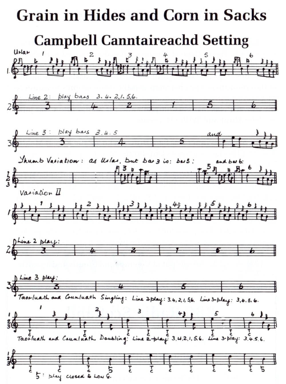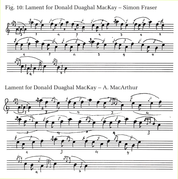 に亘った両クランの争いがようやく治まった頃。The MacArthur パイパーとして最初に名を知られているのは、Angus。彼は1733年の書類に "judicial rental of the Sleat and Trotternish" と書かれていて、領主に仕えるパイパーとして通常よりも安価な土地使用料を 認められていた事が記されている由。 Angus には Charles、Neil、Iain Ban という3人の息子が居ました。長男の Charles MacArthur がパイピング・ファミリーたる The MacArthurs の歴史の中で最も有名なパイパーです。しかし、現代の我々のとって最も重要な存在は、Charles の甥に当たる、初代 Angus の孫である Angus MacArthur です。 ![]() なぜなら、五線譜に書き下ろされた楽譜集としては、最も古い物の一つである MacArthur-MacGregor MS は、1820年に当時 80才を過ぎ既に死期も間近に迫っていた Angus MacArthur の口伝を、The MacGregors の偉大なパイパーの一人である John MacGregor が楽譜に書き下ろしたものだ からです。 Seumas の話がここまで至った所で、MacArthur-MacGregor MS に収録されている30曲のトップに掲載されている "The Big Spree" を Malcolm MacRae が演奏。演奏の前には Seumas によって、日頃聴いている PSスタイルとの相違点が説明されています。 暫し演奏を楽しんだ所で、Seumas はこの MS の意義について語ります。その中に出てくるピーブロックの性質を示した幾つかの表現に共感するので、一部を抜き書きします。 "It and all the tunes in the MacArthur Manuscript are written strictly in bars with time signatures, and yet we know that piobaireachd is never meant to be played as barred music. These writers(その前に言及している Joseph MacDonald と共に指している)were putting the free-flowing music of ceol mor - our unchained melodies - into a strict tempo form, which was of course entirely wrong. But what else could they do? They were only learning or being advised by other musicians about staff notation, and these other musicians were probably totally unaware of the unfettered nature of piobaireachd. As old Angus MacPherson used to say, 'You can't put a man's soul behind bars.' " (太字は引 用者) (マッカーサー写本のすべての曲は、拍子記号付きの小節で厳密に書かれているが、我々はピーブロックが決して小節に閉じ 込められた音楽として演奏されるべきものではないことが分かっている。これらの楽譜に書き下ろした人々は、ピーブロック の自由な音楽性、つまり、鎖につながれていないメロディーを、厳格なテンポの形に置き換え たのだが、もちろんこれは完全に間違っている。しかし、それ以外に彼らに何ができたというのだろう。彼らは五線譜を学ん だり、他の音楽家からアドバイスを受けたりしていただけだ。他の音楽家はピーブロックの自由な性質を全く 知らなかったのだろう。 Angus MacPherson がよく言っていたように、「人の魂を小節の間に入れ ることはできない」のである。) 現在、ピーブロック・ソサエティーが所有しているこのマニュスクリプトの原本は、NLS(スコットランド国 立図書館)で保管されている由。しかし、この楽譜は通常のパイプミュージックと比べて5線譜上で2線下に書かれている(⇒ 参照) ため、直に読み取るのは非常に厄介。そこで、今回演奏者として参加している Andrew Wright と Malcolm MacRae が 過去2年間を費やして全てを書き直し中。いずれは John MacFadyen Memorial Trust の 事業として出版される予定であり、全てのパイパーが容易に The MacArthurs の伝承したパ イピング・スタイルにアクセス出来る様になるでしょう、と誇らしげに紹介しています。 その成果がその後 2001年に Frans Buisman による詳細な解説付きでリリースされた "The MacArthur - MacGregor Manuscript of Piobaireachd(1820)" です(⇒ デジタル本)。つまり、実際のリリースまでには、この時から更に10年の 年月を費やしたという事になります。 この後、Seumas の話は The MacArthurs の中で最も称賛されているパイパーである Charles MacArthur に戻ります。ここからの下りには例の BBC のテレビ番組で Seumas が "Lament for Patrick Og MacCrimmon" を紹介する際に語っていた Iain Dall MacKay に関する興味深い逸話が出てくるので、本文をそのままカット&ペーストして引用します。 ![]() 18世紀半ば(50〜60才頃)には Charles MacArthur の名声は非常に高くなっていて、Patrick Og の孫である Donald Ruadh MacCrimmon(1743〜 1825)は、"MacArthur's particular graces" を習得するために Charles MacArthur の下に半年間派遣されたと言われています。 Charles