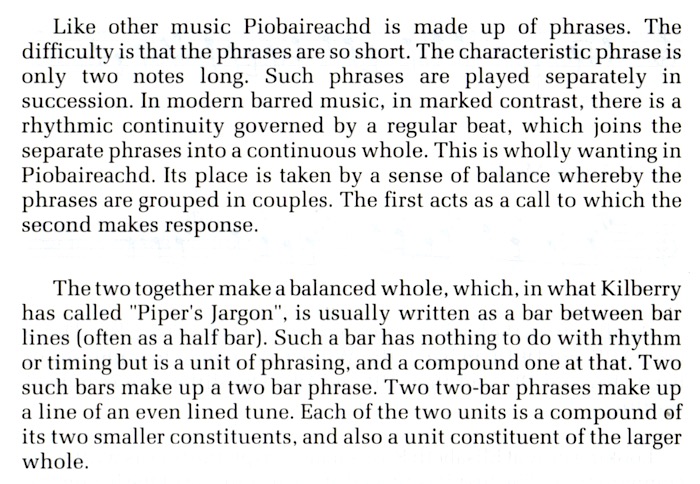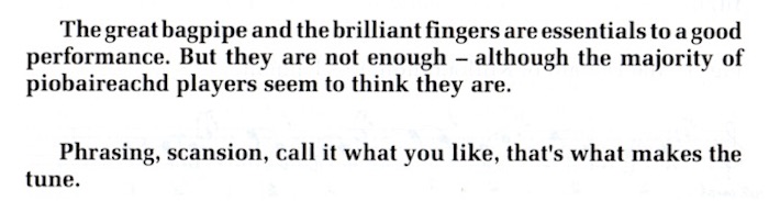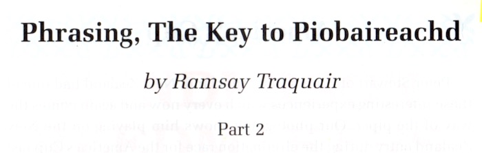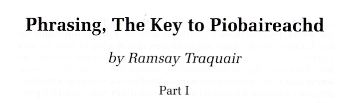 の前にはおよそ15頭の牛、馬、山羊、豚が一列に並んで彼を訝しげに眺めてい たそうです。もう一通のバーミンガム在住の読者からの投稿は、右の写真付 き。文章は殆どありませんが、言わずもがなですね。 P22 Pipe Major Jock Speirs は1ページの追悼記事です。この号の表紙写真の人物。名前で察しがつく通り、あの Iain Speirs の祖父です(⇒1987年12月号)。1908年生まれとの事なの で、享年82才 だった由。 ![]() P25 Phrasing, The Key to Irreproachable は実に半年振りの純粋なピーブロックネタ。2回連載の今回は Part1。筆者は Ramsay Traquair という人。これまで 聞いた事の無い名前です。 そもそも奇妙な姓なので英国人なのか?…とググってみると、20世紀前半に活躍した同姓同名のスコットランド 人建築家がヒット。紛れも無くスコットランド人のファミリーネームの様です。 …で、その内容は?と言うと、次の様に始まります。楽理&英語に弱い私が無