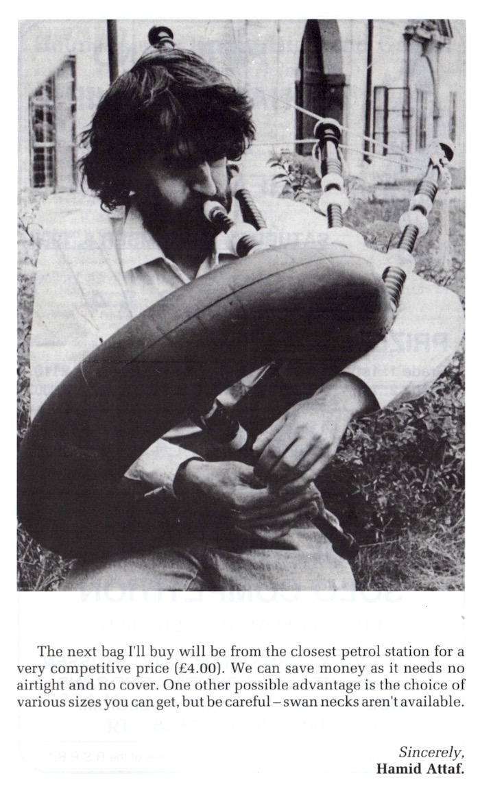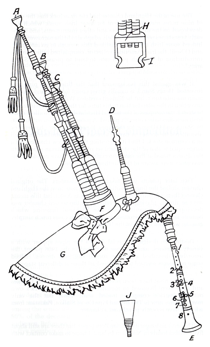 "Piping Times" はこの号で目出たく通 巻500号を迎えた由。…かと言って、誌面や記事に特段変わった所は有りません。しいて言えば、P8 Morning Mail 欄に The Scottish Pipers' Association のプレジデントたる、Angus J. MacLellan からのお祝いのメッセージが 投稿されている程度。まあ、これも殆ど身内みたいなもの。 足掛け42年。悠々たる大英帝国的にはこの程度の年月は、単なる通過点の一つなのでしょう。淡々としたものです。 その Morning Mail には先月に続い て、2 月号 の「バグパイプを聴いた時の動物たちの反応」をテーマにした投稿に対する リアクションが1通掲載されています。 この投稿者が飼っているスコッチ・テリアは、ハイランド・パイプの演奏は至って満足げに聴き入るそうです が、ノーサンブリアン・スモール・パイプ(言うまでもありませんが、イングランドのパイプ)の演奏が始まる と、落胆した表情で吠え続ける、との事。 P36 Brien Boru Pipes とタイトルされた記事は、通常 Brian Boru Pipes として知られているパイプに関する記事。 記事の量は下の一面のイラストを挟んだ2ページ弱。 私自身はこのパイプについてこれまでは殆ど知識が無かったのですが、この記事を読んでみて初めて、この一風変わったバグパ イプが誕生した経緯、年代、さらには発明者(発想者?)、主に製作に携わったメイカー、また様々なバリエーションについても 知る事が出来ました。 さりとて、今更30年前の記事を丁寧に翻訳しても余り意味が無さそうなので、手