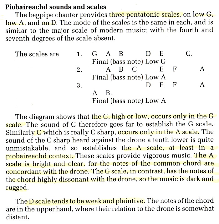 P44 Phrasing, The Key to Piobaireachd は先月号に続く Part2。 量的には5ページ弱ですが、何故か Part1で展開されていた個々の曲のフレージングについて解説するのは一旦中断して、装飾音に関する解説が1ページほど展開されています。内容は推して 知るべしなので省きます。そして、続くのが次の章。 ![]() 3つのペンタトニック・スケールについては既知の内容ですが、それぞれのスケールの構成音が持つ性質とそれに起因 する「雰囲気」についてはっきりと言葉にして説明した文章は初めてです。
