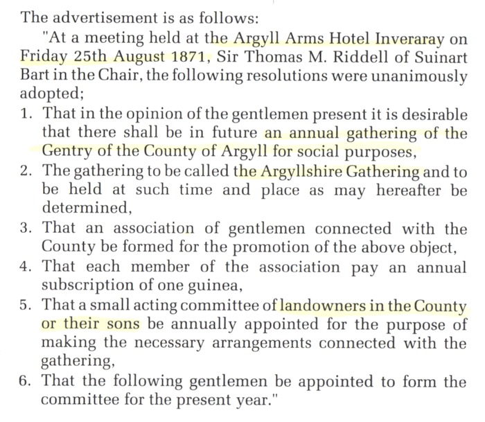ロイヤル・ウェディングが多くの衆目を集めるのは世の常です。特に、この結婚はスコットランド繋がりという点で は、数世紀ぶりの出来事。アーガイルの人々はこの機会を最大限に活用する事にしました。The Oban Times にはその年の初めから、この結婚に関する記事が溢れていました。町や村は旗や垂幕で飾られ、地主は住民たちのためにダンス・パーティーを催し、貴族階級の ためには舞踏会やパーティーが開催されました。 実際の結婚式は 1871年3月21日にロンドンのウィンザー城 St. George's Chapel で催されたのですが、アーガイルでの祝賀ムードは、新婚の2人が実際 に地元に戻って来たこの年の8月まで高揚感が続きました。 1871年9月9日付け The Oban Times に、8月25日に開催された発起人会議で決定した次の様なイベント要旨が掲載されました。 ![]() 続けて、掲載されていた委員会のメンバーの代表は言うまでも無く、