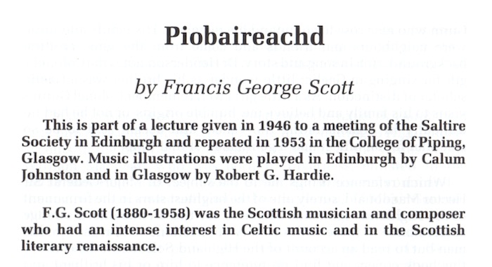 P24 Piobaireachd は、タイトル的にはそのものズバリのピーブロックネタですが…。 ![]() リードによると、これまでにも幾つか紹介した様な、過去(1953年)の記事の再掲載との事。そもそもの記事のオリジ ナルは更に遡った1946年のある講演の様です。講演者 Francis George Scott は20世紀前半に活躍した作曲家。 "War or Peace" や "Lament for the Children"、"Bells of Perth" といった曲を例にとって「ピーブロックとなどの様な音楽か?」といった事について解説した内容です。講演の合間に Callum Johnston と Robert G. Hardie による演奏が披露された由。記事の量は4ページ。一部というだけあって、最後は唐突に終わっています。 非パイパー音楽家による、これまでピーブロックは聴いたことが無いような一般人向けのごく初歩的な講演なので、詳細に紹介 するまでも無い内容でした。 【2023/2追記】 2022年秋に "Piping Times" デジタル化完了を受け、1948年創刊以来の全てのバックナンバーを順次読み進めていて、この記事の著者である、Francis George Scott による、1953年に行われた極めて興味深い講演録に出会い、その講演録をパイプのかおり第42話(2022/10)で全文対訳で紹介し ました。 先日来、以前に紹介した記事を見返していて、この記事のリードを読み「あれっ、あの講演録はここに再掲載されていたの か…。つまり、2年前に一度目を通していたという事…?」と、2020年当時には殆どスルーした自身の不徳を恥じ入る気持ち に(一瞬)なりました。 しかし、改めて読んでみると、この講演録はパイプのかおり第42話で紹介した講演録とは全く別物である事が明らかです。講 演者とタイトルが同じで、講演時期も同じなので紛らわしい限りですが、リード文を読み解くと、どうやらこの記事はエジンバラ の The Saltire Society で1946年に行われた講演録の様です。つま り、1953年にグラスゴーの College of Piping で "repeated" されたというのは「同じ講演者が同じタイトルで講演した」という意味であり、そして、そ の講演録がパイプのかおり第42話で紹介した物だという事ではないでしょうか。何とも分かり難いリード文ですが…。 最初は、2020年の紹介文を書き直さなくてはならないと思いましたが、改めて読んだ後でも、1946年の講演内容に対す る印象は変わらないので、敢えて書き直しは致しません。しかし、この講演も決してつまらない訳ではないので、デジタル化の恩 恵を享受するためにも、一度原文に目を通される事はオススメします。 P32 The Argyllshire Gathering - The Early Years は Part4。 1884年から 1888年まで5年間の各コンペティションの結果やジャッジの名前が、4ページに亘って詳細に描かれています。 P40 Grain in Hides and Corn in