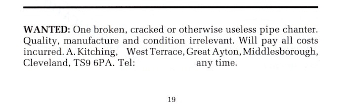 真も、今月号で146枚目になりました。振り返って見ると判ると思いますが、表紙写真に取り上げられているのは概して人物の写真(時には肖像画)が定番です。バグ パイプの一部や記念碑など、パイピングに関連する事象が登場する事が有りますが、それはごく例外的。ですから、人物が出て いない表紙写真だと「一体何だろう?」と思ってしまいます。今回は 1985年9月号以 来のワンちゃんの写真です。 写真キャプションには "Laddie - see page 49" と有ります。P49 Evening Post に目を通すと、2月号以 来続いている読者投稿シリーズ「バグパイプを聴いた時の動物たちの反応」の第4弾でした。(第2弾4月号、第3弾8月号) 米国ミッドランド州在住のこの読者の愛犬は Sheltie(シェトランド・シープドッグ)で、名前が "Laddie" との事。一見、そうは見えない風貌ですが、これは子犬の頃の写真だそうです。 そして、ハイランド・パイプの音が好きな Laddie が好きな曲は、言うまでも無く "Highland Laddie" というオチでした。 因みに Laddie の先代はさほどハイランド・パイプが好きでは無かったそうです。 しかし、名前だけは Larid of Loch Lomond を意味する "Lochie" という名前だった由。 毎号、所々のページ下端に数行の個人的な告知が出ています。多くは 特定の 年代のヴィンテッジ・パイプの売買に関する情報(求める or 売りたし)です。その他には "Piping Times" の特定の号を求めるなど、内容は様々。 しかし、この号の P19 に掲載されていた WANTED 告知は少々奇異な内容。一体、何が目的なのでしょうか? ![]() (30年前とはいえ、個人情報に配慮して番地と電