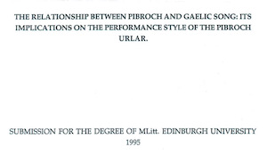 そもそも、この基金の趣旨は故 John MacFadyen が深く関心を寄せていた事柄について、彼の遺志を継いで追求する事。具体的には "a greater understanding of piobaireachd amongst the public, more intense study into the history of the music and its relationship to other forms of Gaelic music(the harp, Geelic song, etc)." (下線部:引用者)と 記されています。 そして、この趣旨に沿ったこの間の活動(毎年スターリング城で開催されている講演&リサイタル、The Silver Chanter リサイタルへの支援、その他の様々なパイピング・コンペティションへの支援 etc.)について記述。 これら趣旨の前半部分に関する活動についてはそれなりに判っていましたが、今回の記事で特に興味深く感じたのは、 趣旨の後半部分(↑下線部)に関する今後の計画について、更に詳し く説明された以下 の記述。 It has in the past couple of years undertaken two further big tasks. The first, a dream of John MacFadyen, was to establish a research post in a University context into the connection between piobaireachd and Gaelic song. We thought long and hard about the right person to do this work - it needed somebody who has a mature understanding of piobaireachd and also Gaelic song. With the help of the MacRobert Trust, the Trust commissioned Allan MacDonald, one of the celebrated piping brothers from Glenuig in Moidart and winner of the Clasp at the 1989 and 1990 Northern Meetings, to undertake this research under the auspices of the School of Scottish Studies of Edinburgh University. Allan's work is nearing its conclusion and we hope to publish it in due course. この Allan's work は "The Relationship Between Pibroch and Gaelic Songs" というタイトルで、その後、1995年にエジンバラ大学の学位論文として発表されました。 そして、この論文は何故かケンブリッジ大学の Ross Anderson 教授が運営する Ross's Music Page というサイトに Allan MacDonald's Thesis としてアップされている事が、いつだったか APCのブログで紹介されていました。 ![]() あちこちに教授のものと思しき手書きのメモが書かれていますが、何よりも章ごとに分割さ れていて読み難いので、全部をバインドした形でこのサイトのサーバーにアップしました。興味のある方はどうぞお目通 し下さい(→カバーページからリンク)。全部で300ページ弱もある力作。私もいつか目を通そうとは思っています が、未だ果たせていませ ん。 記事では、これに続けてもう一つの big task について記述。それは、The MacArthur MS に関する解説本の出版です。そして、この時点では Andrew Wright が MS の楽譜を現代風の楽譜に書き起こす作業をしている事が報告されています。 ご存知の通り、その成果も後日 2001年に "The MacArthur - MacGregor Manuscript of Piobaireachd(1820)" というタイトルで出版されています。(⇒ パイプのかおり第27話参照) これらの経緯を知ると、Alt Pibroch Club の活動に繋がる様々なムーブメントは、ある意味で John MacFadyen の遺志を起点としていた、という事に気付かされます。1980年以降に徐々に盛り上がって来た「もう一つのピーブロック」を探求する動きの素地が徐々に見 えてきました。 さて、話は少々脱線しますが↑で紹介した記述の中、Allan MacDonald に白羽の矢を立てる際に 「The MacRobert Trust の助けを借りて…」と、 ある団体名が出てきました。この団体、恐らく「ゲール文化の保護や振興を目的とした財団」なのだろう? と推測。ネット検索してみたら、現在も活動している様で、財団のサイトが有りました。⇒ The MacRobert Trust ざっと目を通した所では、特段、ゲール文化の保護や振興を目的とした団体ではなさそうでした。ところが、記事作成 の作業を終えた後、改めてじっくりと目を通してみた所、この財団の創立者、Lady MacRobert に関する、悲 しくも極めて印象的なストーリーを知る事になりました。ABOUT THE TRUST → History 何とも、気丈な女性が居たものです。思わぬ所で、奇特な財団の存在を知った次第。 結局、Allan MacDonald と当時の財団との具体的な繋がりが明白に感じ取れる様な情報には行き当たりませんでしたが、恐らく、"Lady MacRobert wanted to provide the means and organisation to foster in young people the best traditional ideals and spirit, …" という彼女の意思に従って、当時の財団が Allan MacDonald の研究に対して共同支援したという事なのでしょう。 P34 "CH" in Canntaireachd は、↑のムーブメントの大きな担い手の一人でもあ り、上記 The MacArthur MS 解説本を執筆した Frans Buisman による記事です。 ページ数は4ページと、彼の論文としては軽い方ですが、例によってこの方な らではの極めて高度な内容故、私如き者には紹介不能。ご容赦願います。 P38 The Argyllshire Gathering - The Early Years は Part5。 1889年から 1892年まで4年間の各コンペティションの結果やジャッジの名前が、3ページに亘って詳細に描かれています。 |