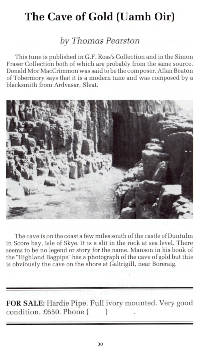 この方お得意の、特定の楽曲に関係する土地を巡る「ピーブロック・サファリ」のシリーズ。幸いにも今回の記事は 中央に配置された写真が殆ど全部で、いつもの難解な文章は僅かに10行だけ。読解の苦労も最小限で済みます。面倒臭 いのでこのページをそのまま転載します。 グーグルマップでスカイ島の "Duntulm" の地名を検索して、投稿されている写真で現地の風景をお楽しみ下さい。この写真で見られる、あの有名なフィンガルの洞窟と似た、柱状節理の合間に開いた洞窟の写真は見当た らない様ですが…。 ![]() このページを丸のまま転載した理由は、先 月号で紹介した奇妙な告知のフォローの意味も あります。このページ下端にある様な告知が、正にこの当時のごくありふれた告知です。この様な告知であれば誰もが納得。 P31 Piobaireachd Society Seminar というタイトルになっていますが、詳しくは "PS Judges' seminar" 。1991年シーズンのセットチューンに関するジャッジ達向け のセミナーなので、内容紹介は省きます。 P32 The